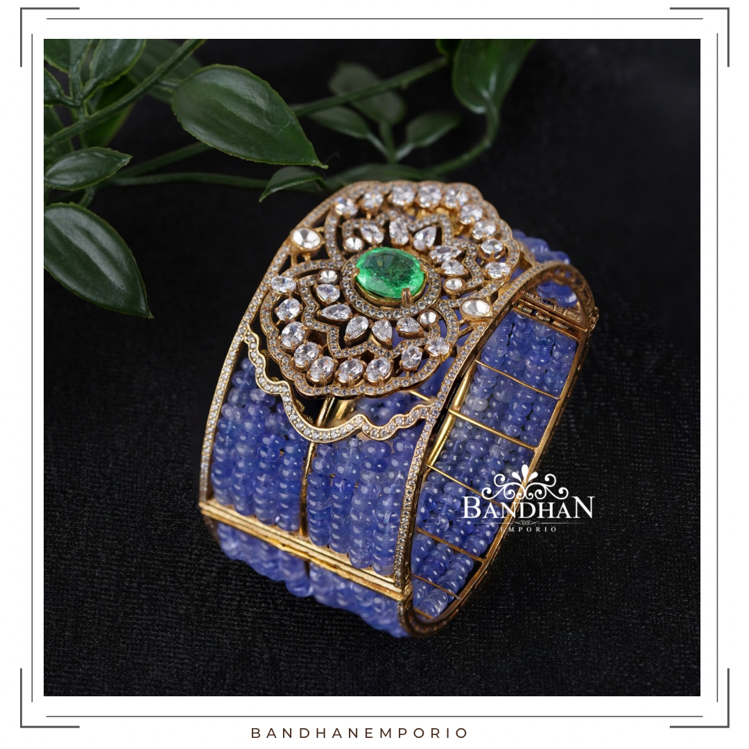 Intricately handcrafted light antique finish bangle, made in 92.5 Silver with 24 ct gold plating, studded with premium quality Swarovski cubic zirconia stones, certified precious Tanzanites and semi-precious emerald. Product comes as openable with 92.5 Silver Hallmark.