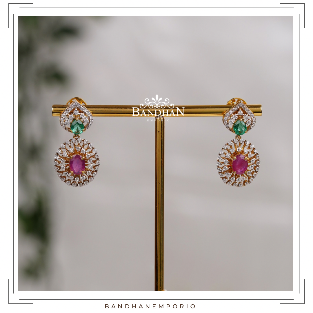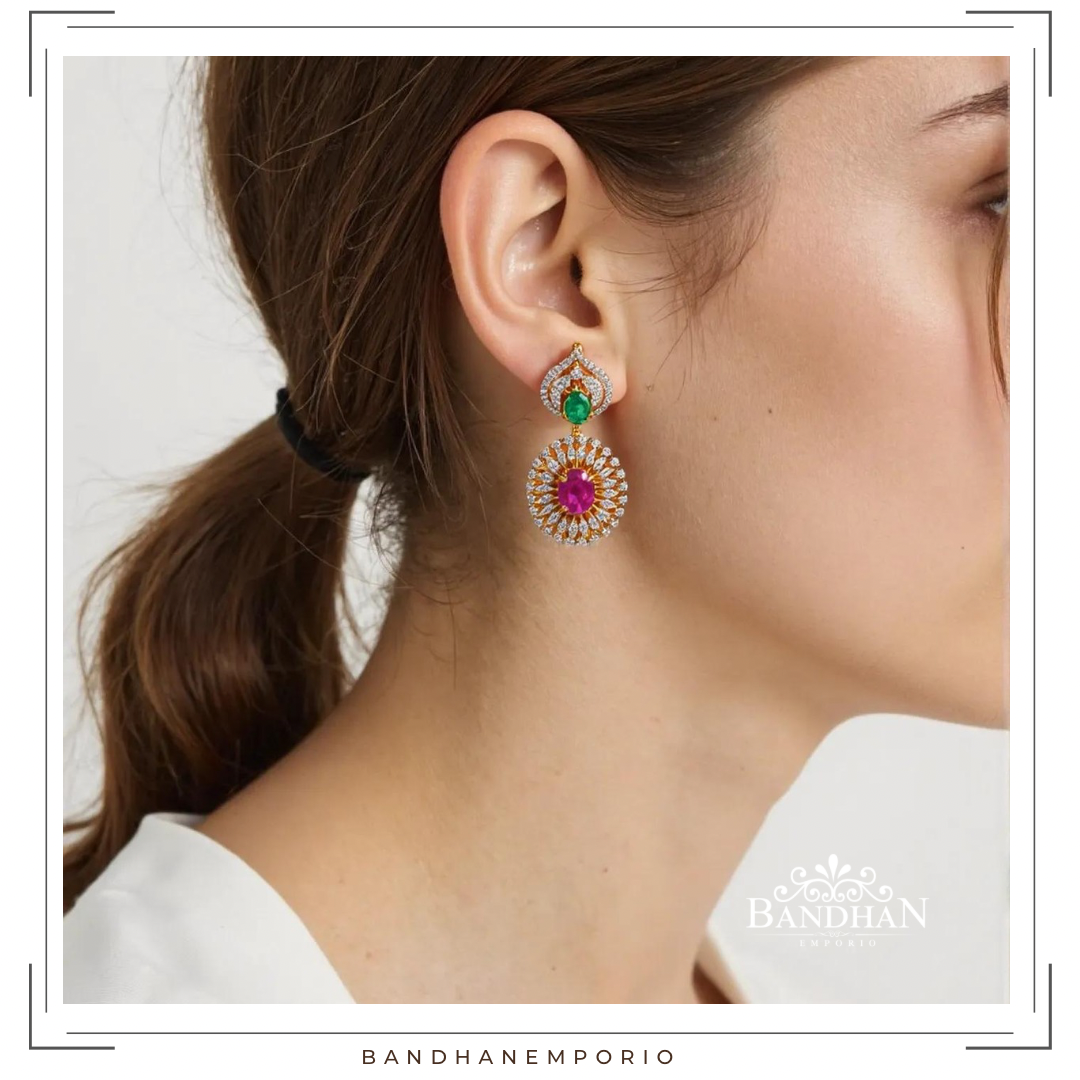 Exquisitely handcrafted Pure Sterling 92.5 Silver hallmarked, 24ct gold plated, Diamond Finish short necklace studded in premium quality certified precious rubies, emeralds and Swarovski cubic zirconia stones. Comes with pair of matching earrings.