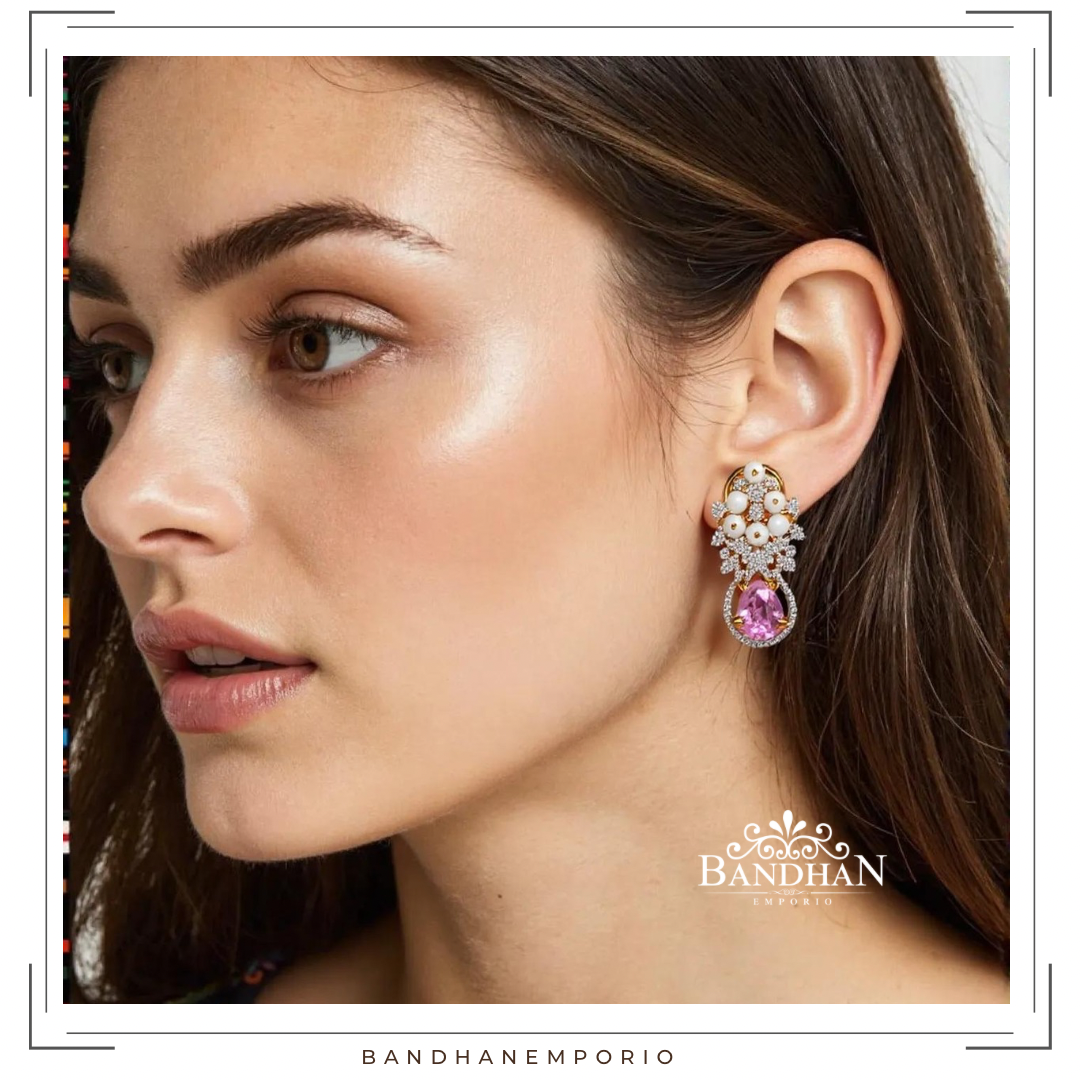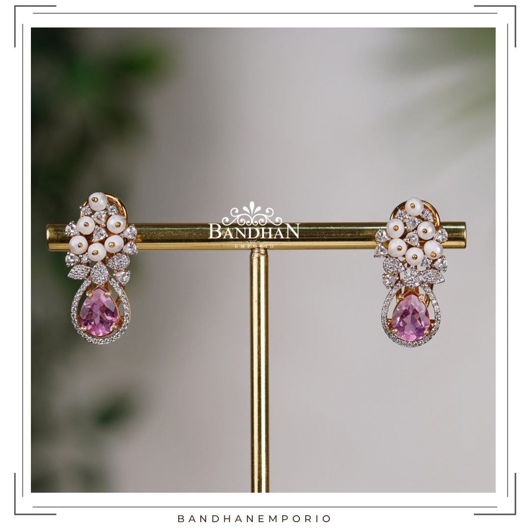 Handcrafted Diamond Finish Pendant set, 92.5 Silver Hallmarked, with 24ct gold plating, studded with premium quality cubic zirconia stones, certified fresh water pearls and certified pink sapphires/rubies. Product comes with a pair of matching earrings. Pendant is detachable. Comes with Hasli chain.
