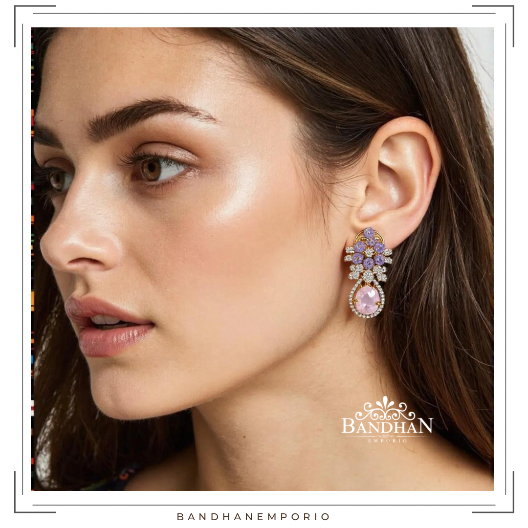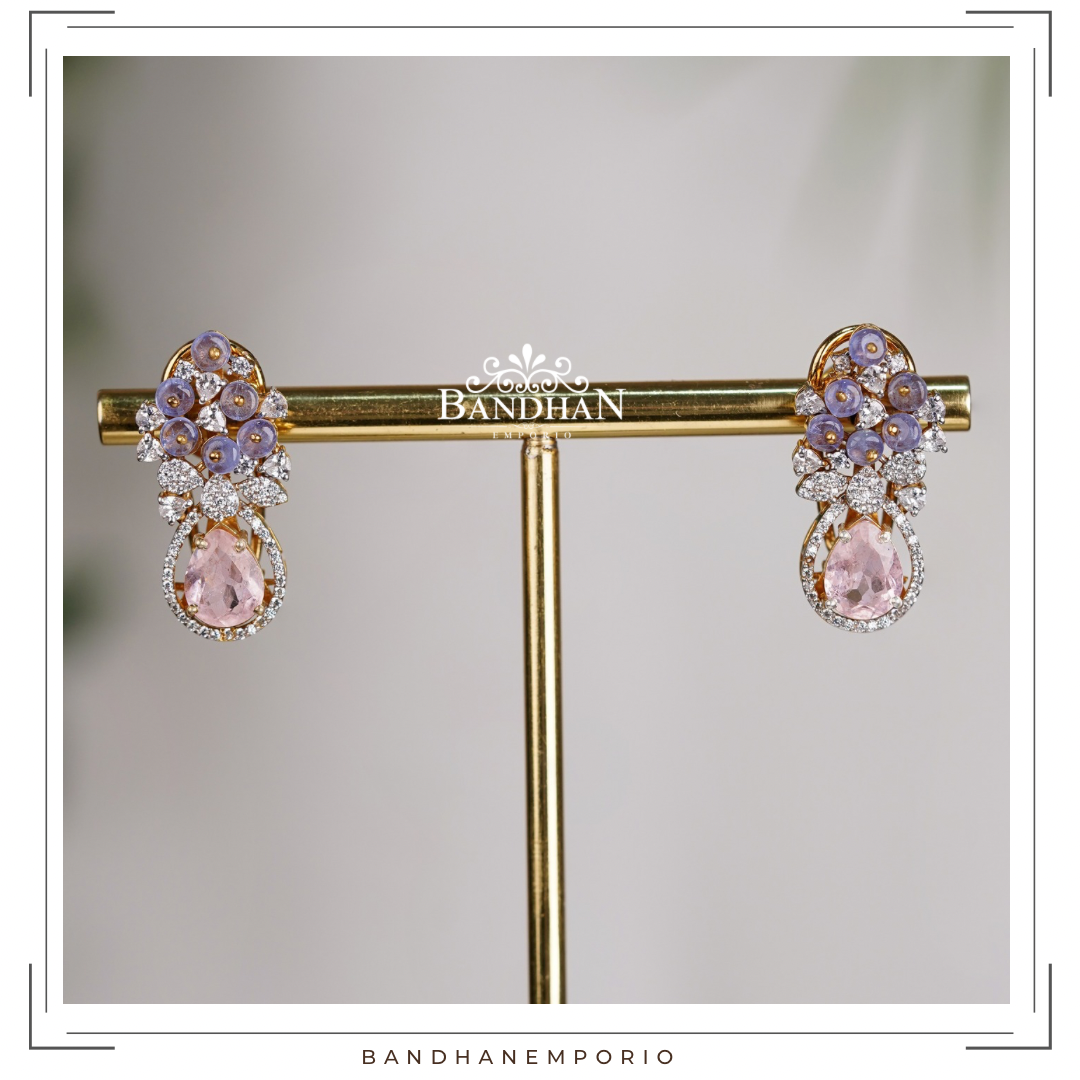 Handcrafted Diamond Finish Pendant set, 92.5 Silver Hallmarked, with 24ct gold plating, studded with premium quality cubic zirconia stones, certified precious Tanzanites and certified pink sapphire/rubies. Product comes with a pair of matching earrings. Pendant is detachable. Comes with Hasli chain.