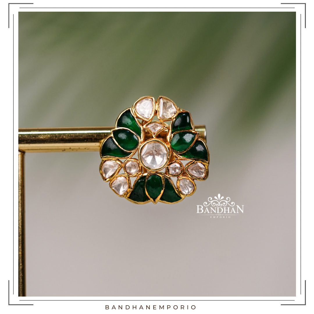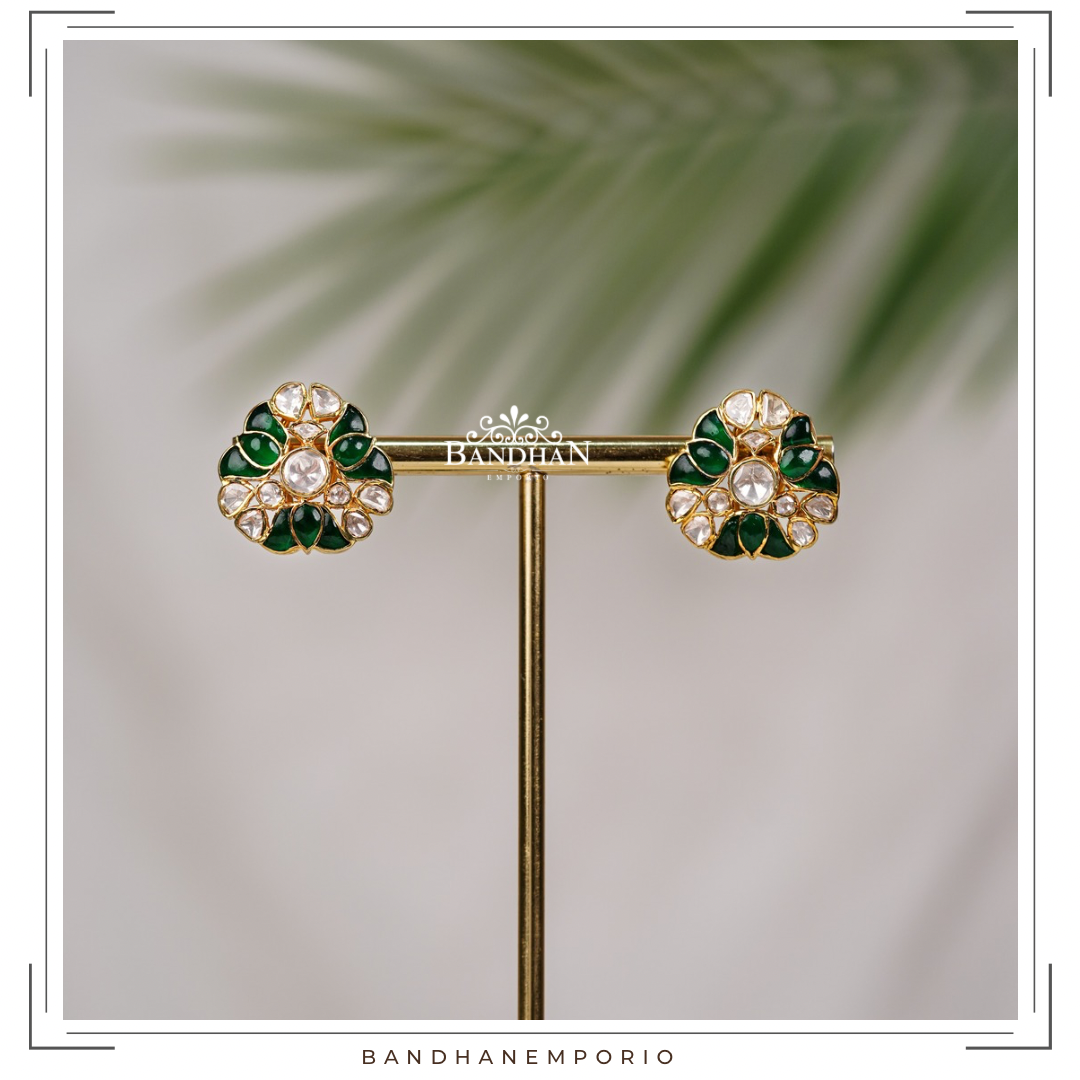 Intricately handcrafted studs, made in 92.5 Silver with 24 ct gold plating, studded with premium quality synthetic Polki and pota stones. Product comes with screwback.