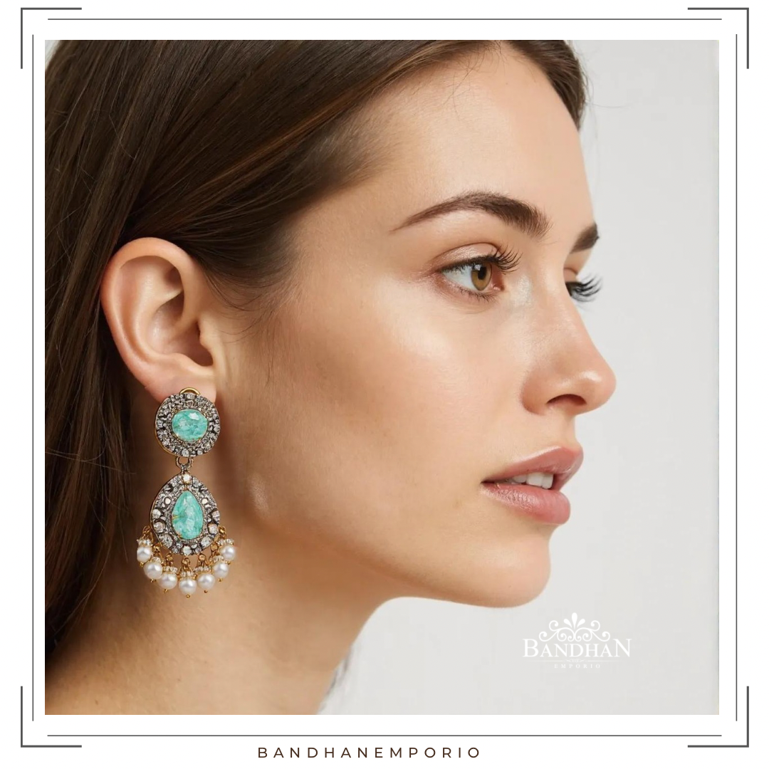 Exquisitely handcrafted Pure Sterling 92.5 Silver hallmarked, Victorian necklace set studded with premium quality cubic zirconia, simulated Polki, certified semiprecious Russian emerald and certified precious fresh water pearls. Comes with pair of matching earrings.