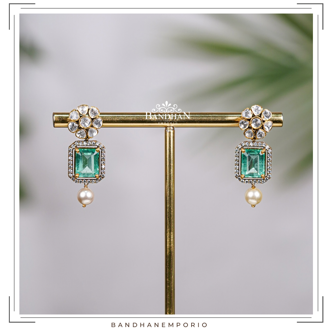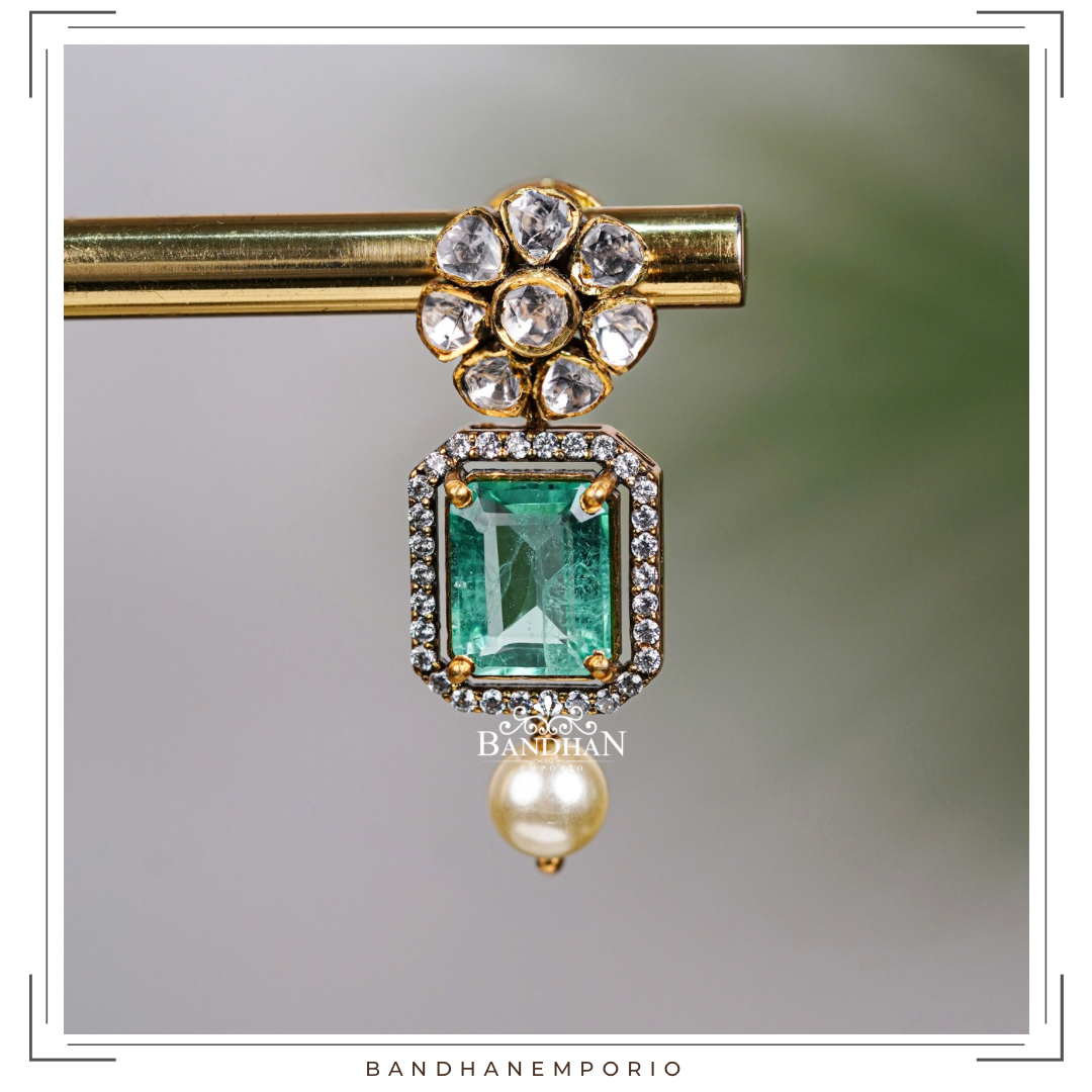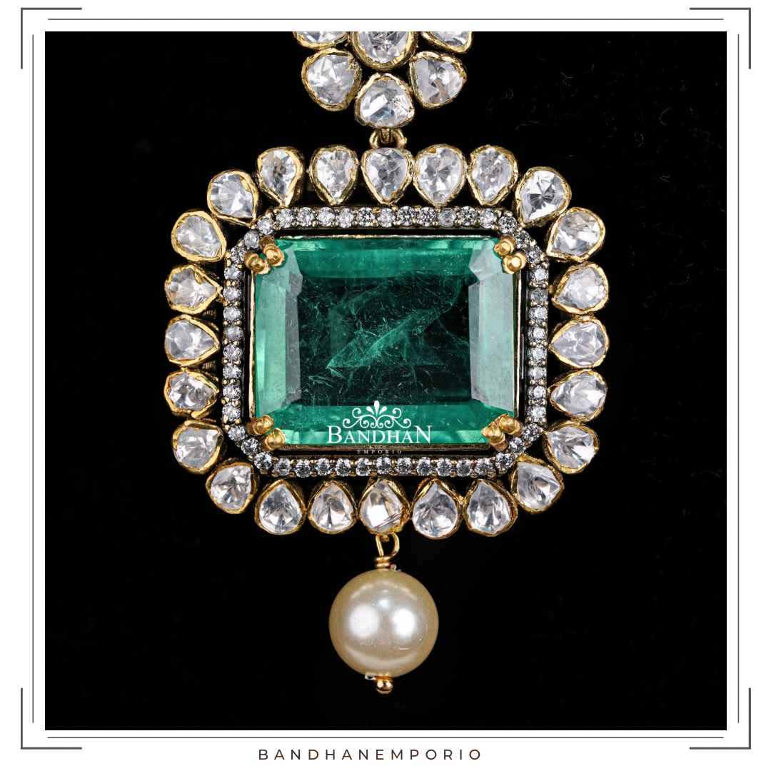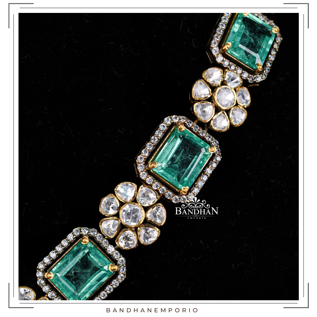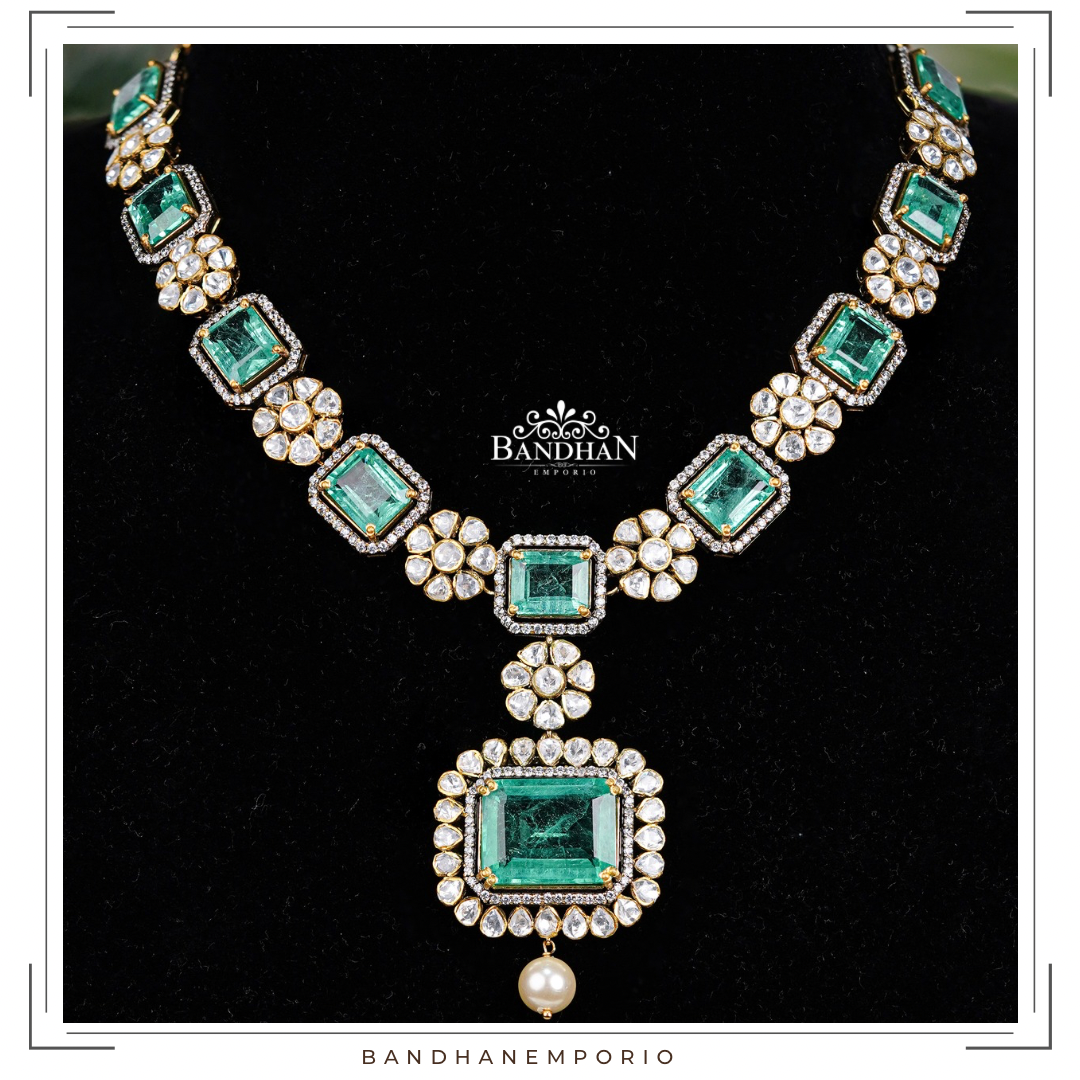 Exquisitely handcrafted Pure Sterling 92.5 Silver hallmarked, Victorian light antique finish short necklace set studded with premium quality cubic zirconia, simulated Polki and certified semi-precious Russian emeralds. Comes with pair of matching earrings.