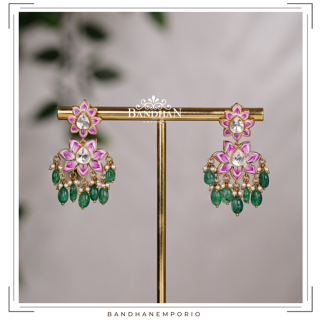 Intricately handcrafted Meenakari Chandbali, made in 92.5 Silver with 24 ct gold plating, studded with premium quality simulated Polki stones, premium freshwater pearls, premium precious natural emeralds. Product comes with screwback and supporting clip