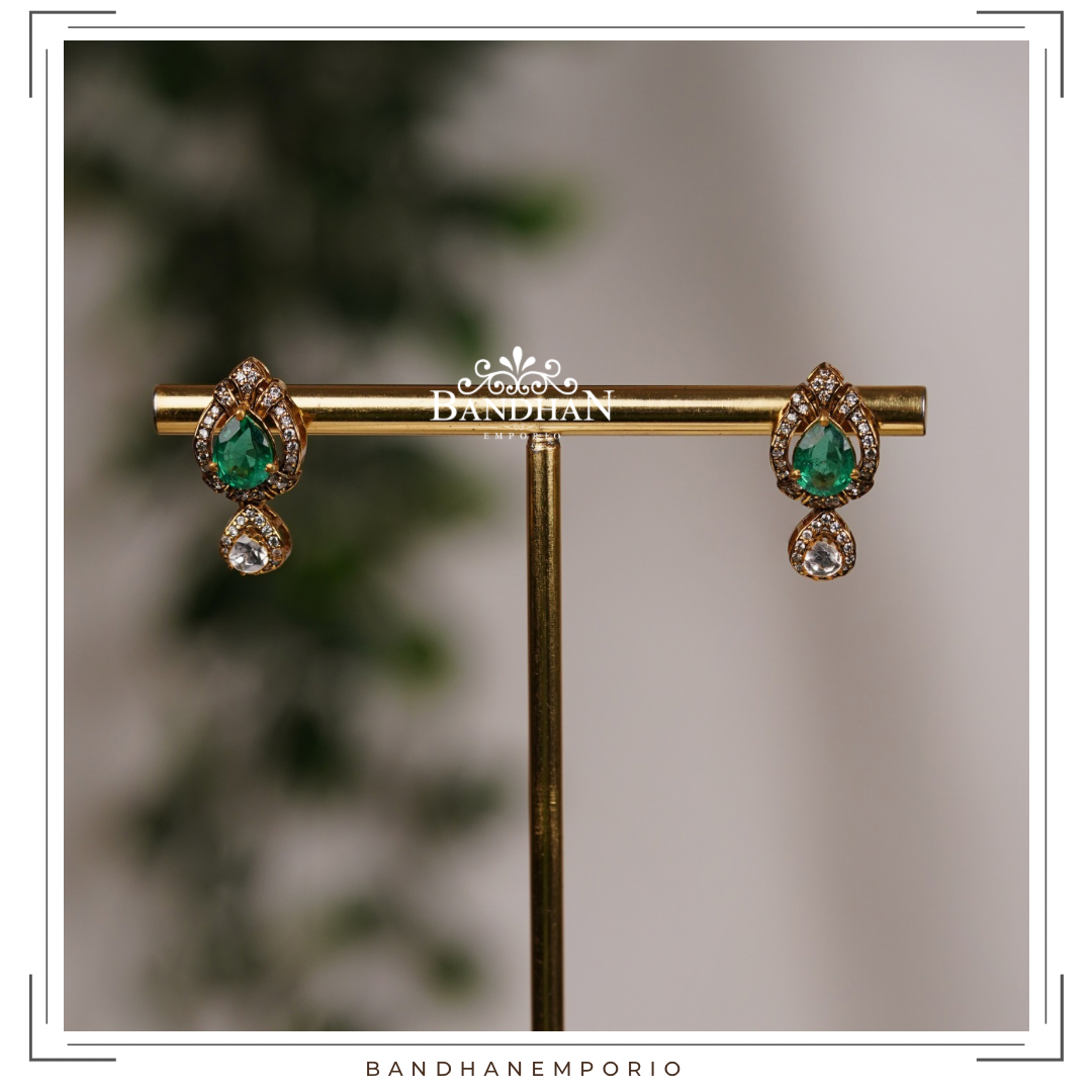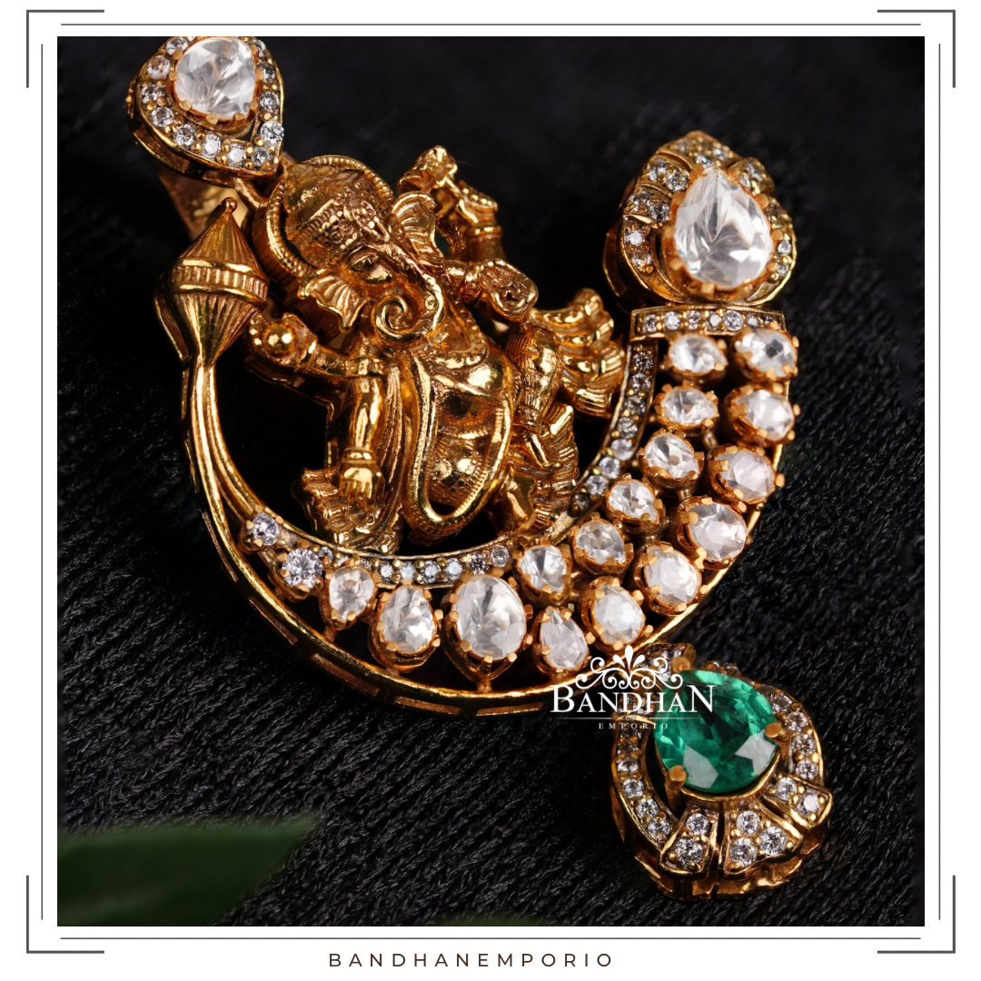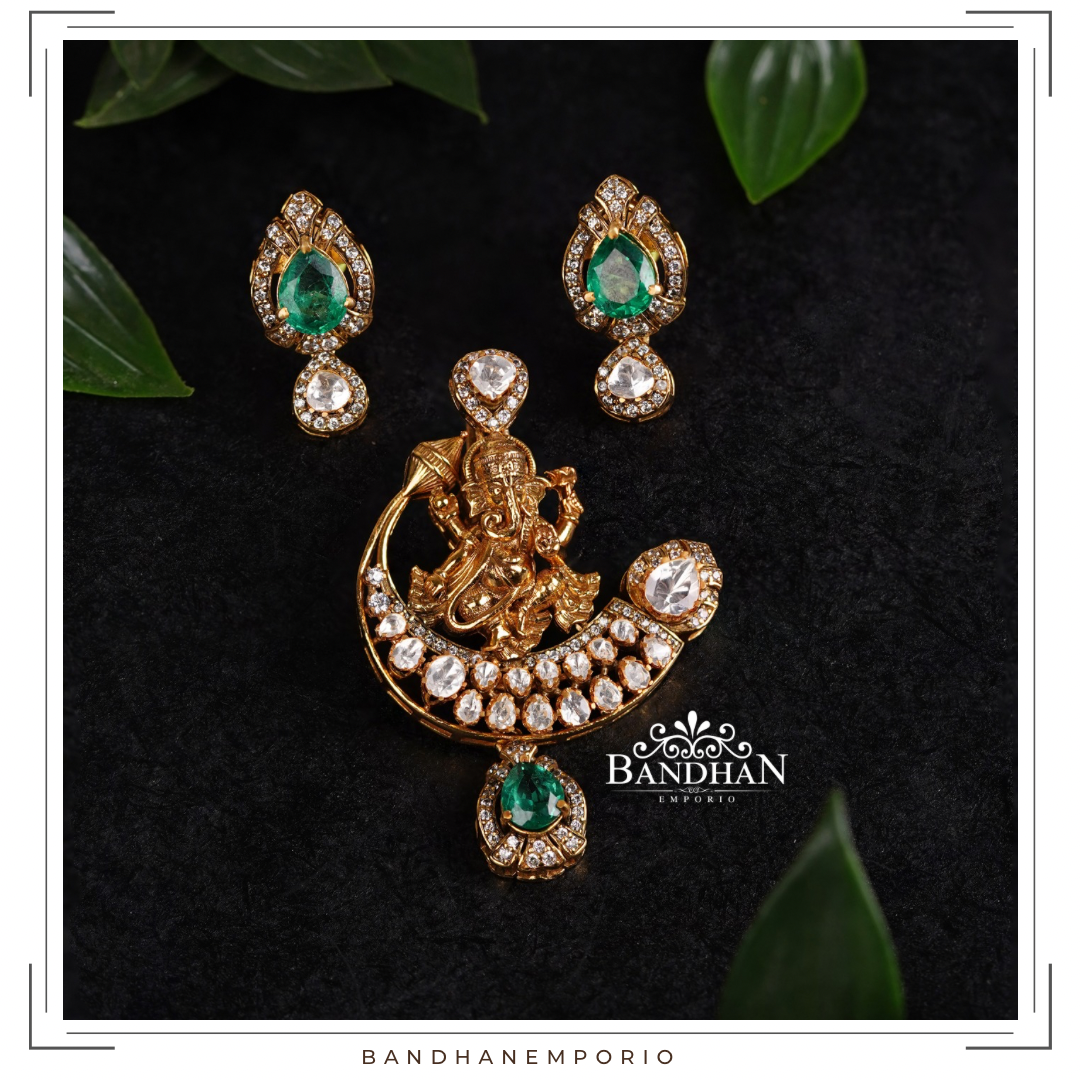 Handcrafted Victorian light antique finish, detachable Ganesh Pendant set, 92.5 Silver Hallmarked, with 24ct gold plating, studded with premium synthetic polkis, premium quality cubic zirconia stones, certified natural emerald. Product comes with a pair of matching earrings. Pendant is detachable.