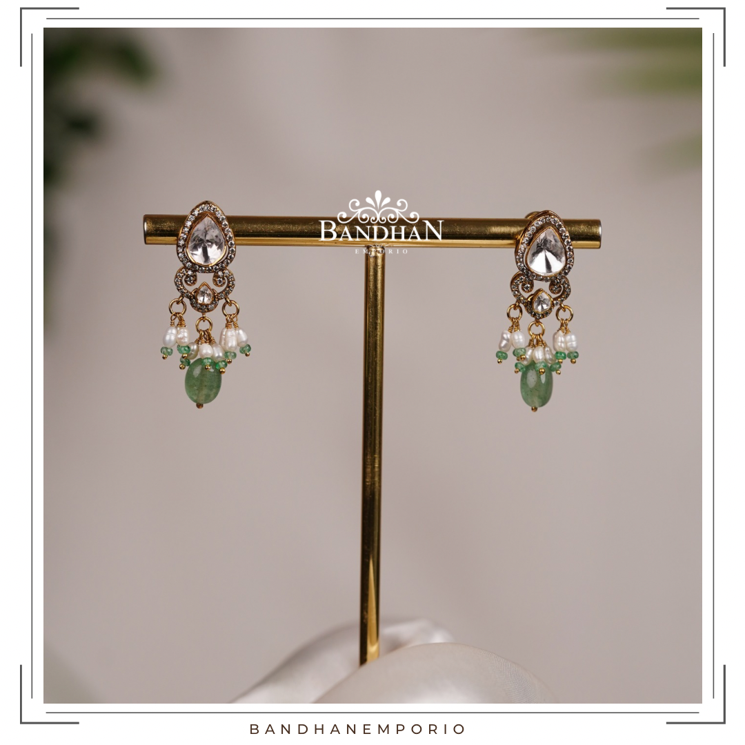 Handcrafted Victorian light antique finish, detachable Pendant set, 92.5 Silver Hallmarked, with 24ct gold plating, studded with premium synthetic polkis, premium quality cubic zirconia stones, certified natural fresh water pearls and precious natural emerald (Aventurine). Product comes with a pair of matching earrings. Pendant is detachable and can be used for black beads. This product as shown in pictures here, comes as pendant with earrings and Hasli.