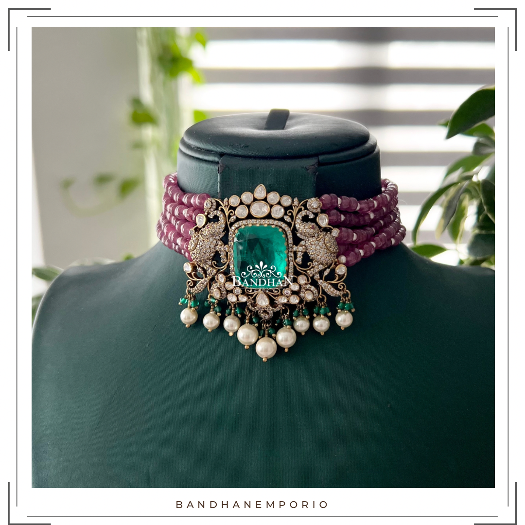 Handcrafted Polki Victorian choker Set, 92.5 Silver hallmarked, with 24ct gold plating, studded with premium quality polki stones, Swarovski stones, Semi-precious Emerald and strung in Swarovski pearls and premium certified rubies, comes with a pair of matching earrings.