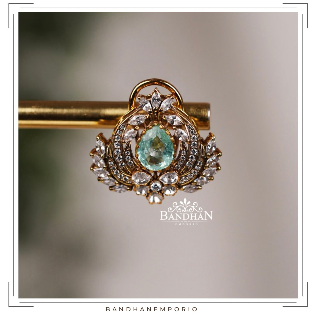 Intricate handcrafted light antique victorian studs, made in 92.5 Silver with 24 ct gold plating, studded with premium quality cubic zirconia stones and certified natural russian emerald. Product comes with 92.5 Silver Hallmark, screwback and supporting clip