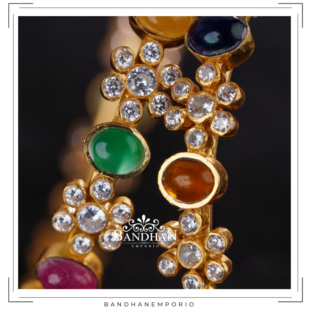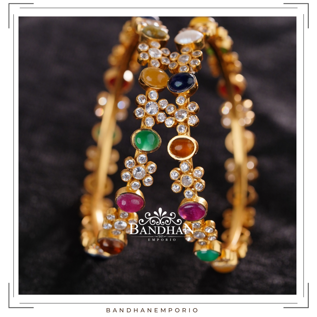 Intricately handcrafted bangles pair, made in 92.5 Silver with 24 ct gold plating, studded with premium quality simulated Polki stones and certified navratan stones. Product comes as openable bangle.