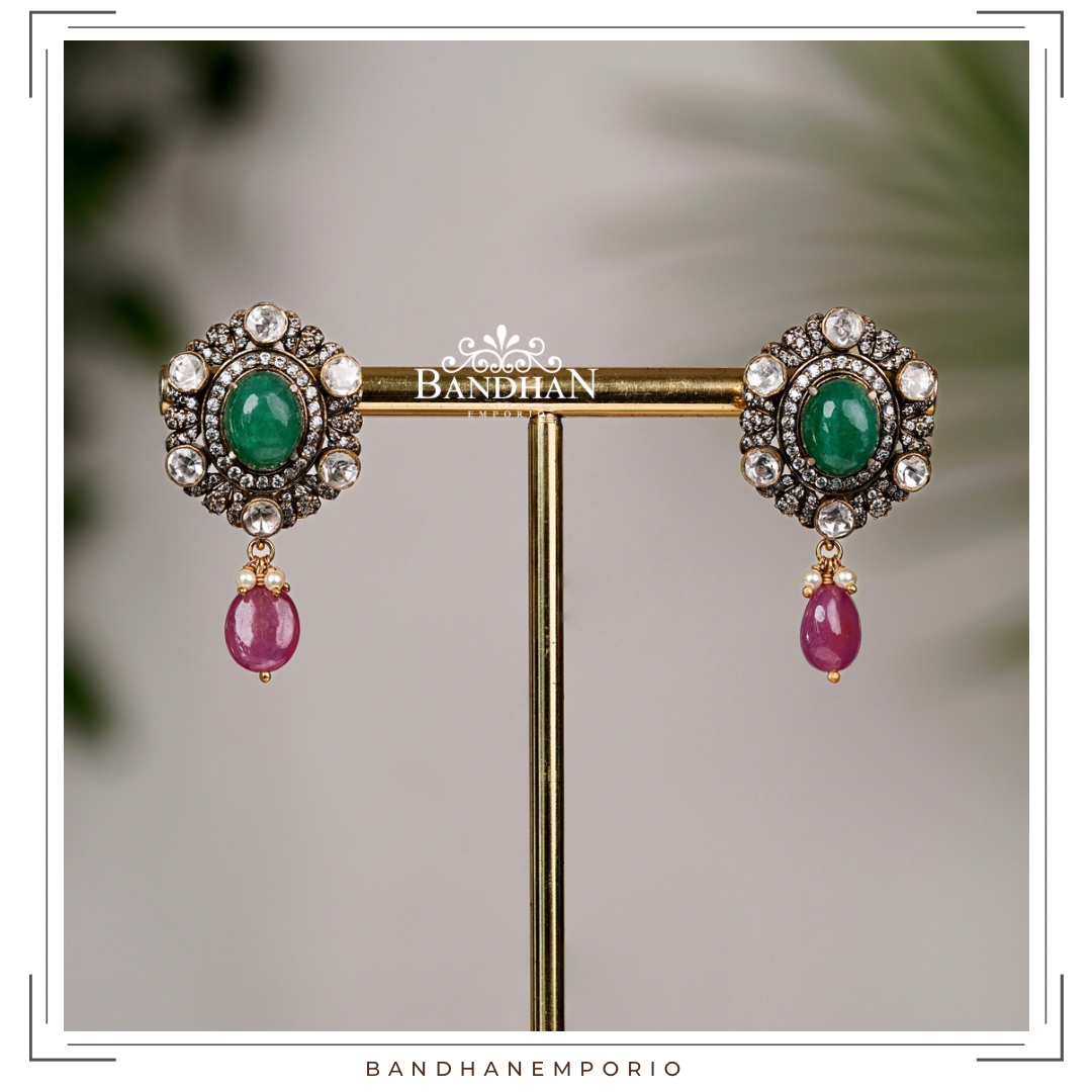 Intricately handcrafted Victorian light antique studs, made in 92.5 Silver with 24 ct gold plating, studded with premium quality cubic zircon stones, synthetic, precious natural emerald and precious natural ruby drop. Product comes with screwback.