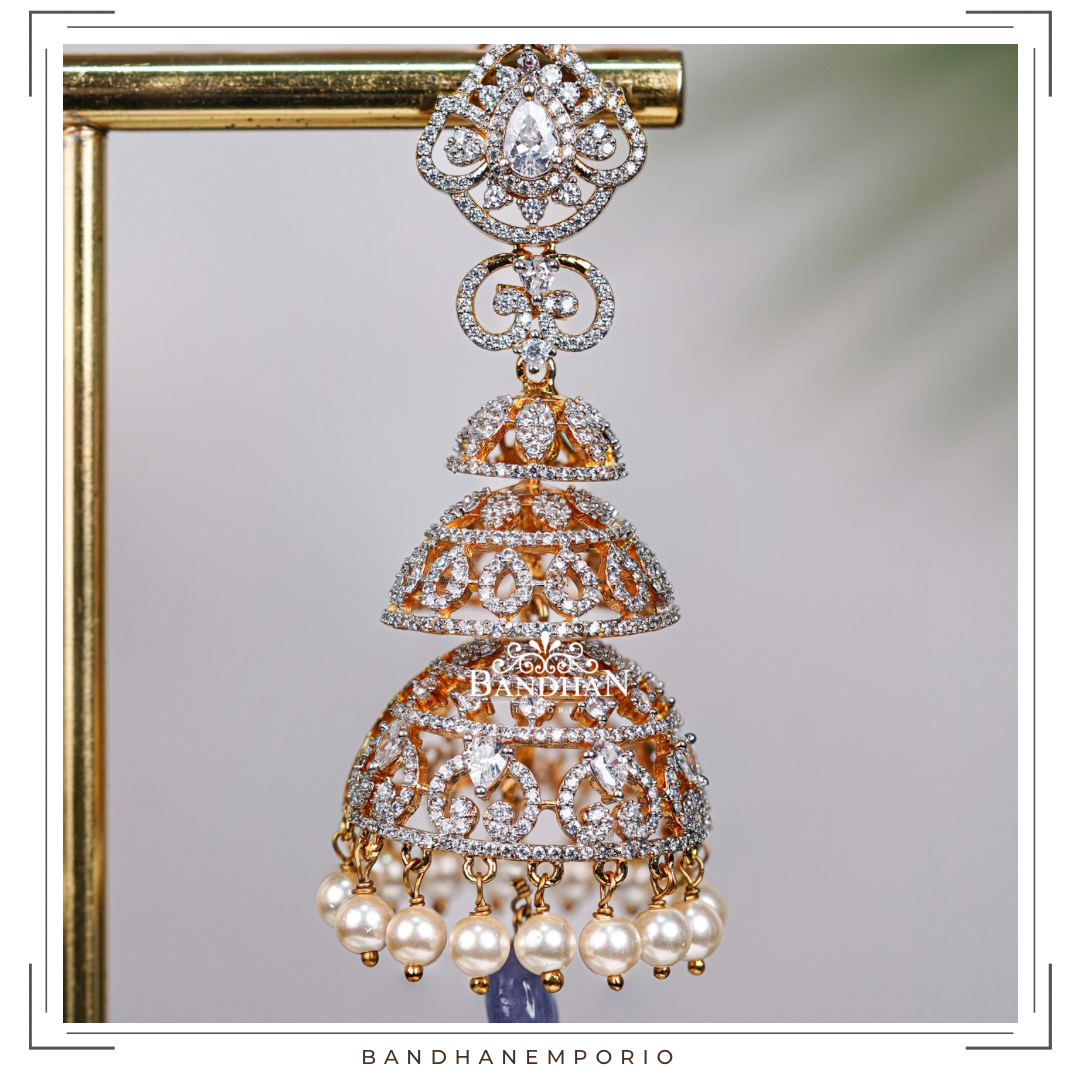 Intricately handcrafted, diamond finish, three tier Jhumkas, 92.5 Silver hallmarked, 22 ct gold plated, studded with premium quality Swarovski stones and precious Tanzanite drop. Product comes with screwback. Light weight.