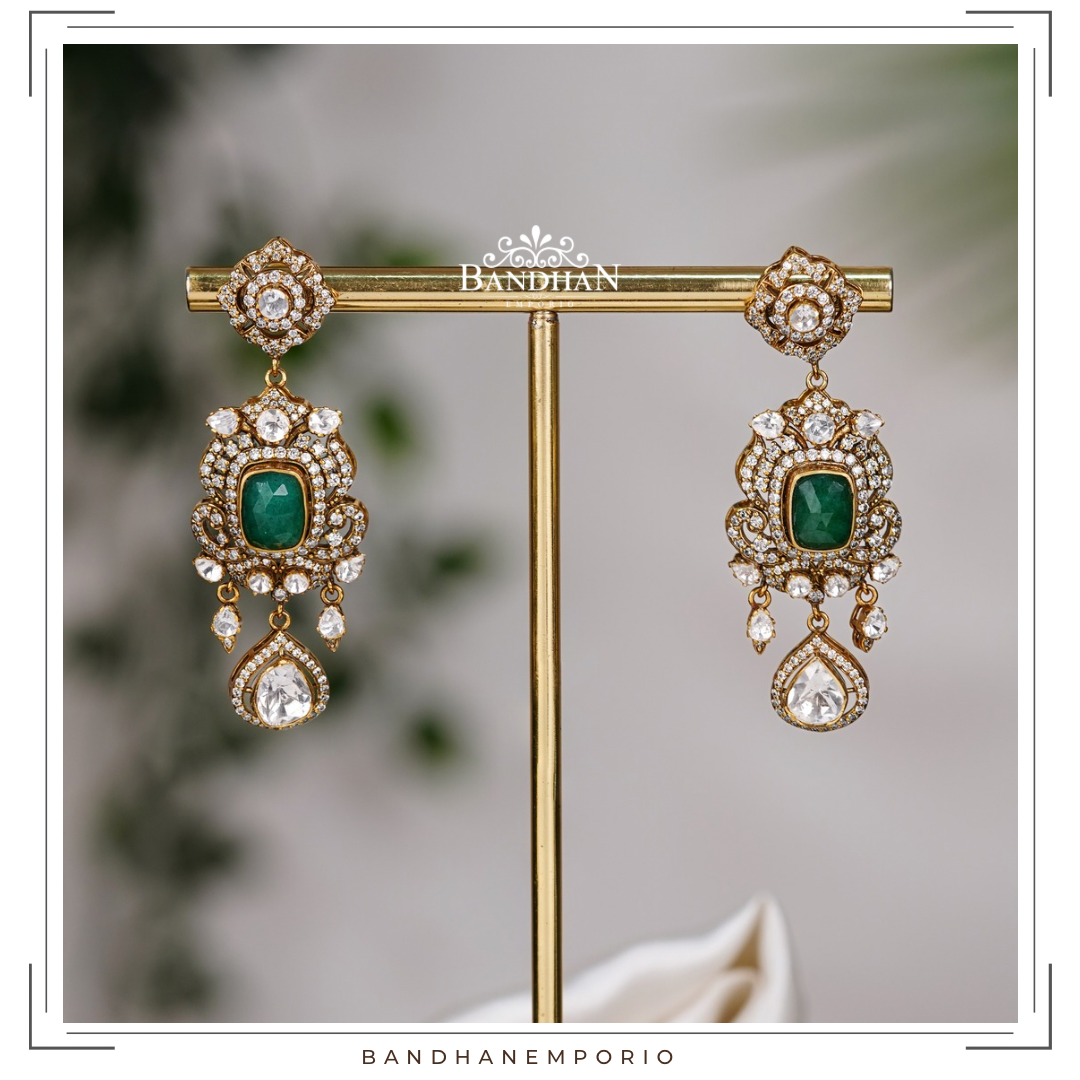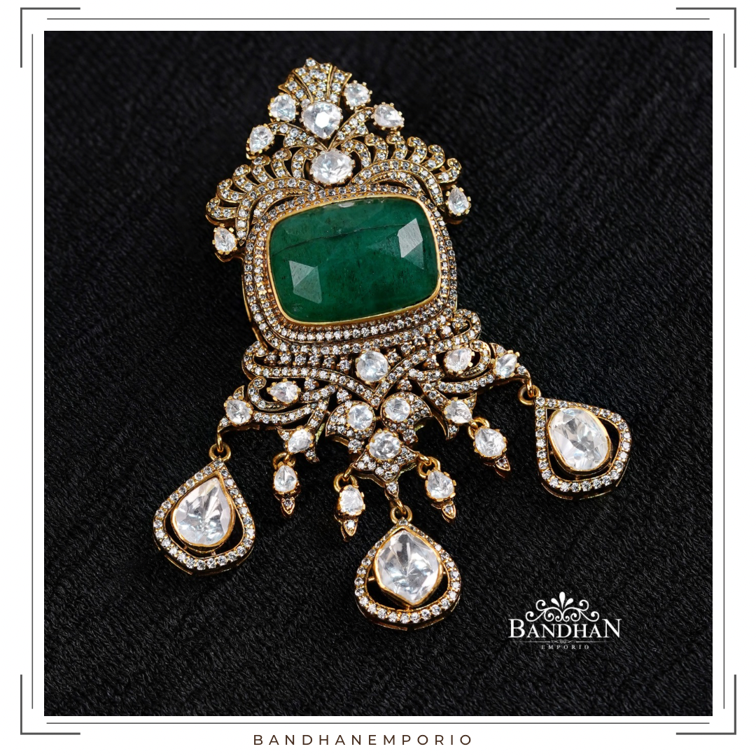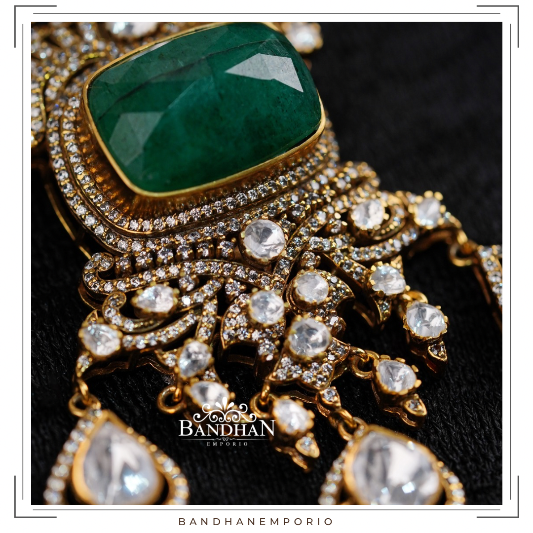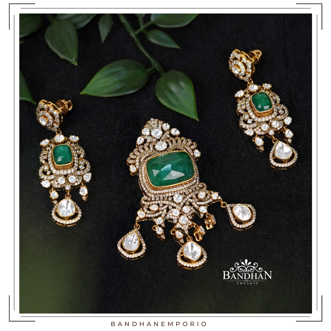 Handcrafted Victorian light antique finish, detachable Regal Pendant set, 92.5 Silver Hallmarked, with 24ct gold plating, studded with premium quality cubic zirconia stones, precious natural centre emerald. Product comes with a pair of matching earrings. Pendant is detachable.