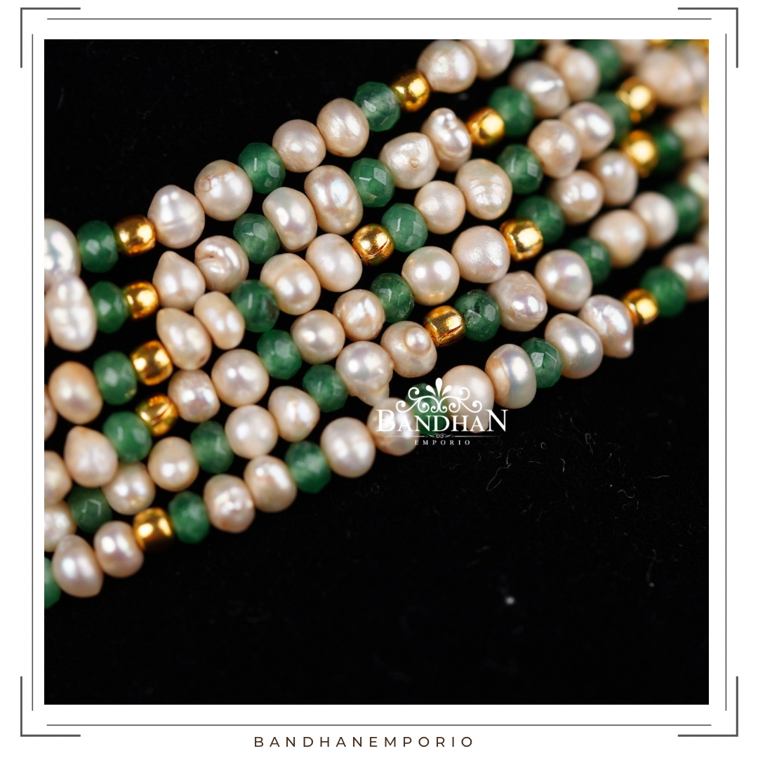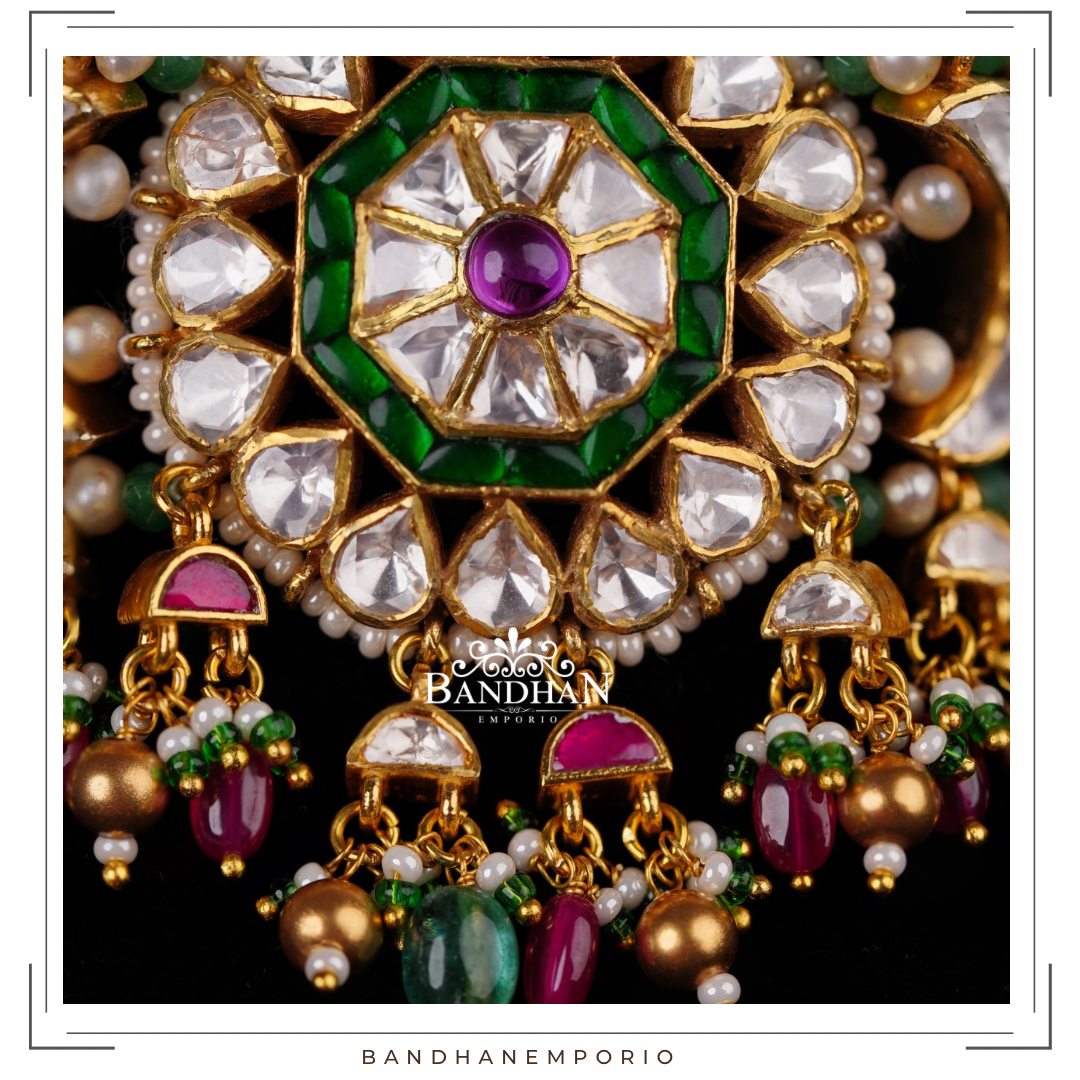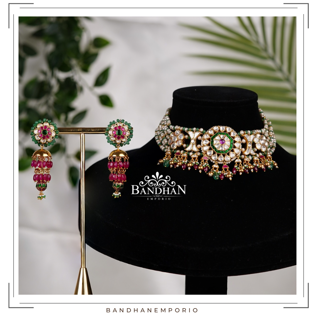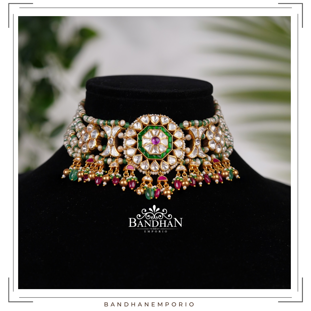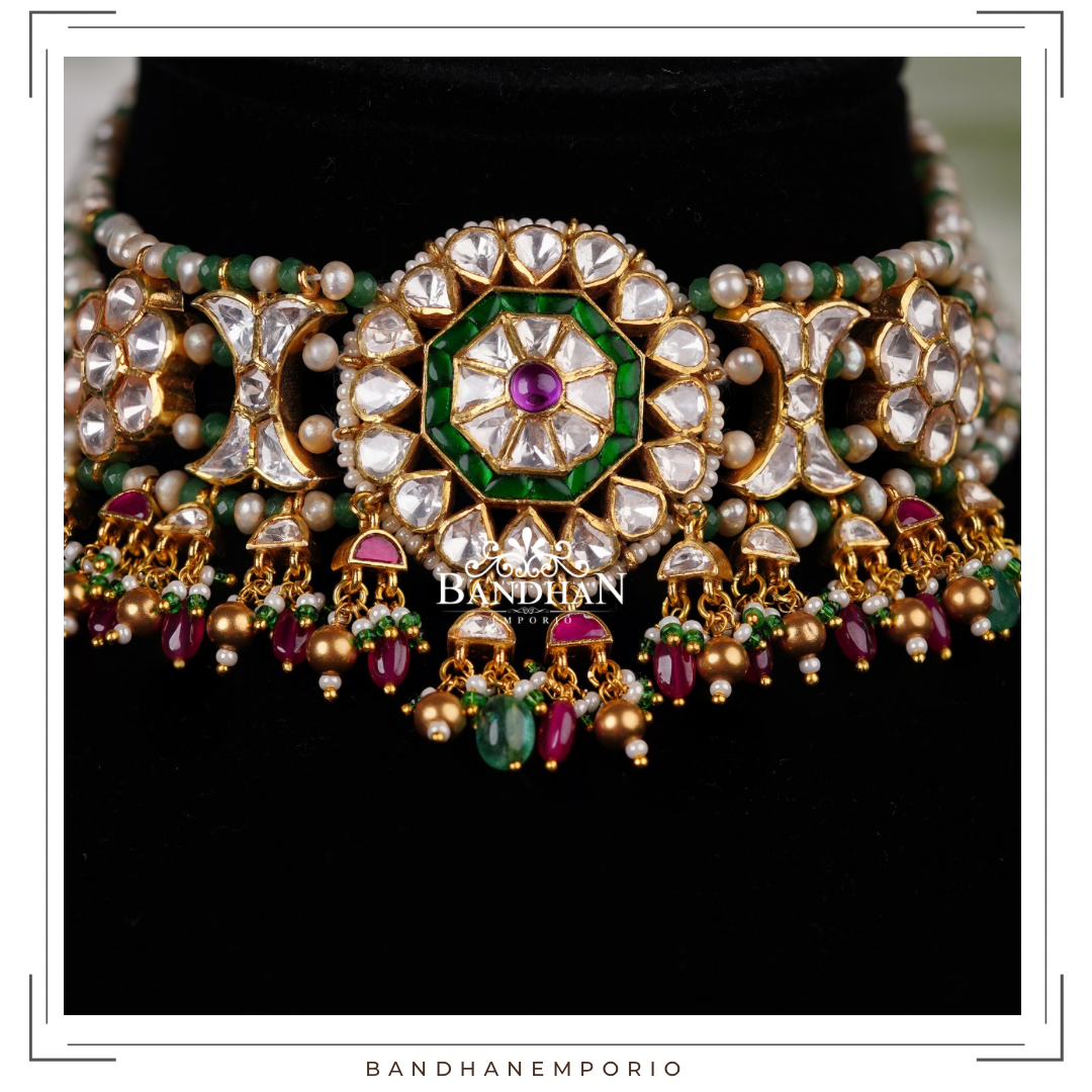 Handcrafted Polki choker Set, 92.5 Silver hallmarked, with 24ct gold plating, studded with premium quality simulated polki stones, premium cubic zirconia stones, embellished in premium Keshi pearls, semi-precious rubies and emeralds. Comes with a pair of matching earrings, with supporting clip and screwback.