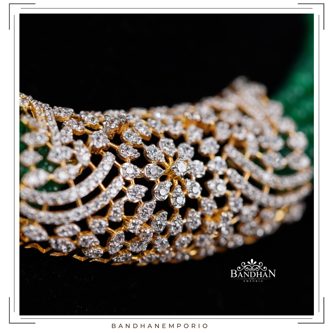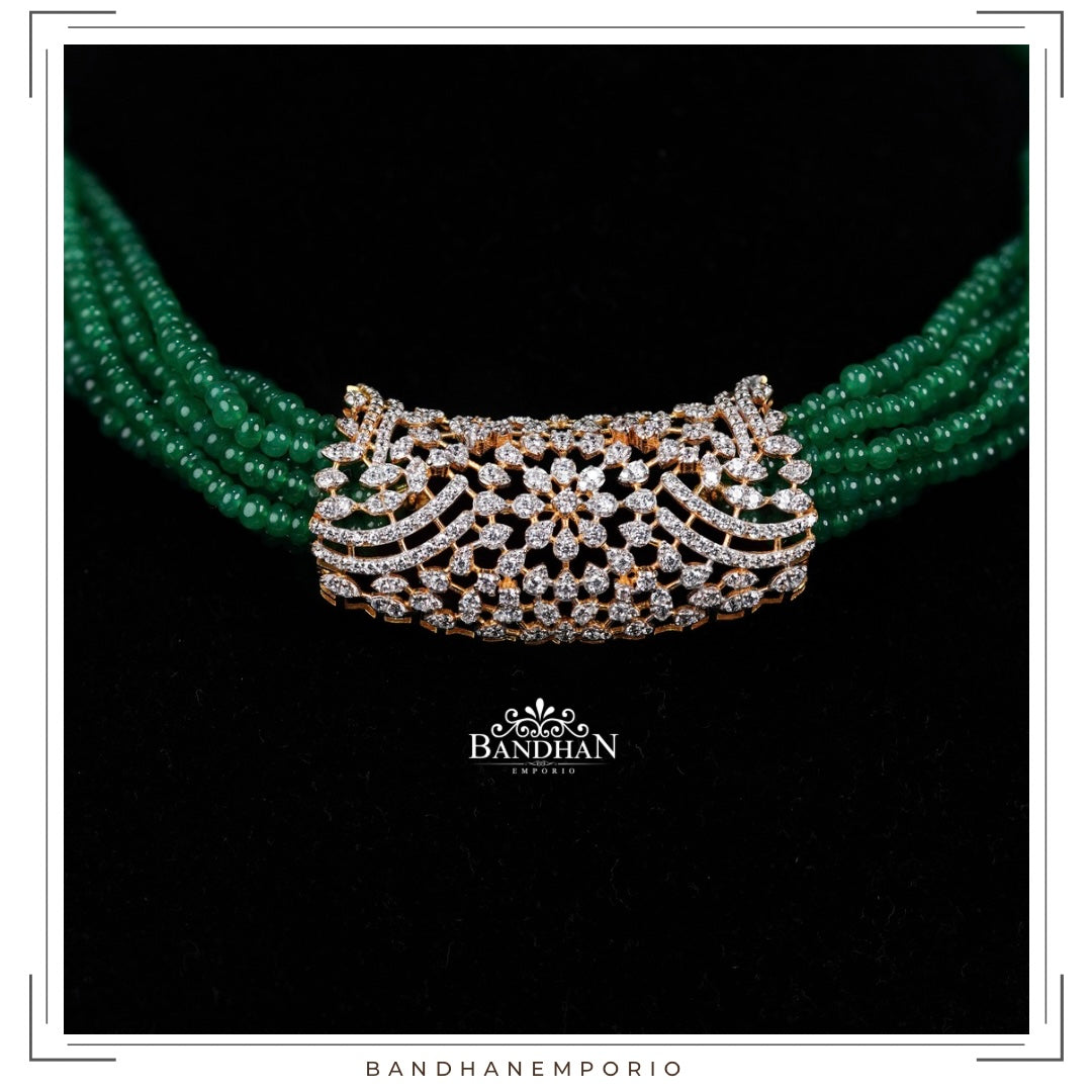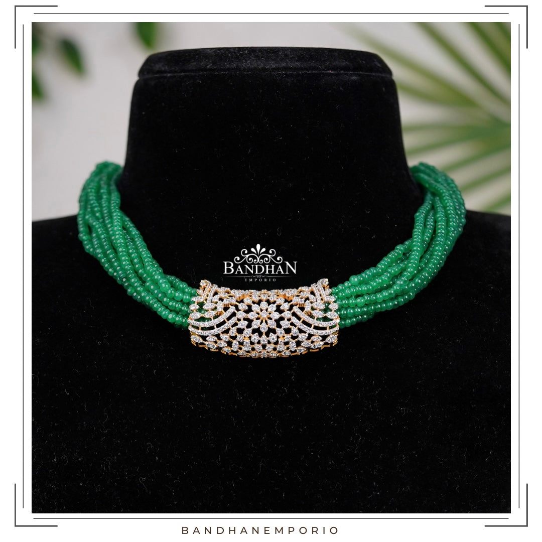 Handcrafted choker Set, 92.5 Silver hallmarked, in diamond look alike, with 24ct gold plating, studded with premium quality cubic zirconia stones, strung in precious natural certified emerald strands. Comes with a pair of matching earrings, with screwback. Detachable centre piece allows change to any colours strands that you have.