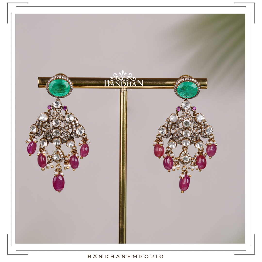 Exquisitely handcrafted Pure Sterling 92.5 Silver hallmarked, 24 gold plated, Victorian antique finish, polki necklace set strung in certified precious natural rubies, emeralds and pearls. Studded with simulated Polki and premium cubic zirconia stones. Comes with pair of matching earrings.