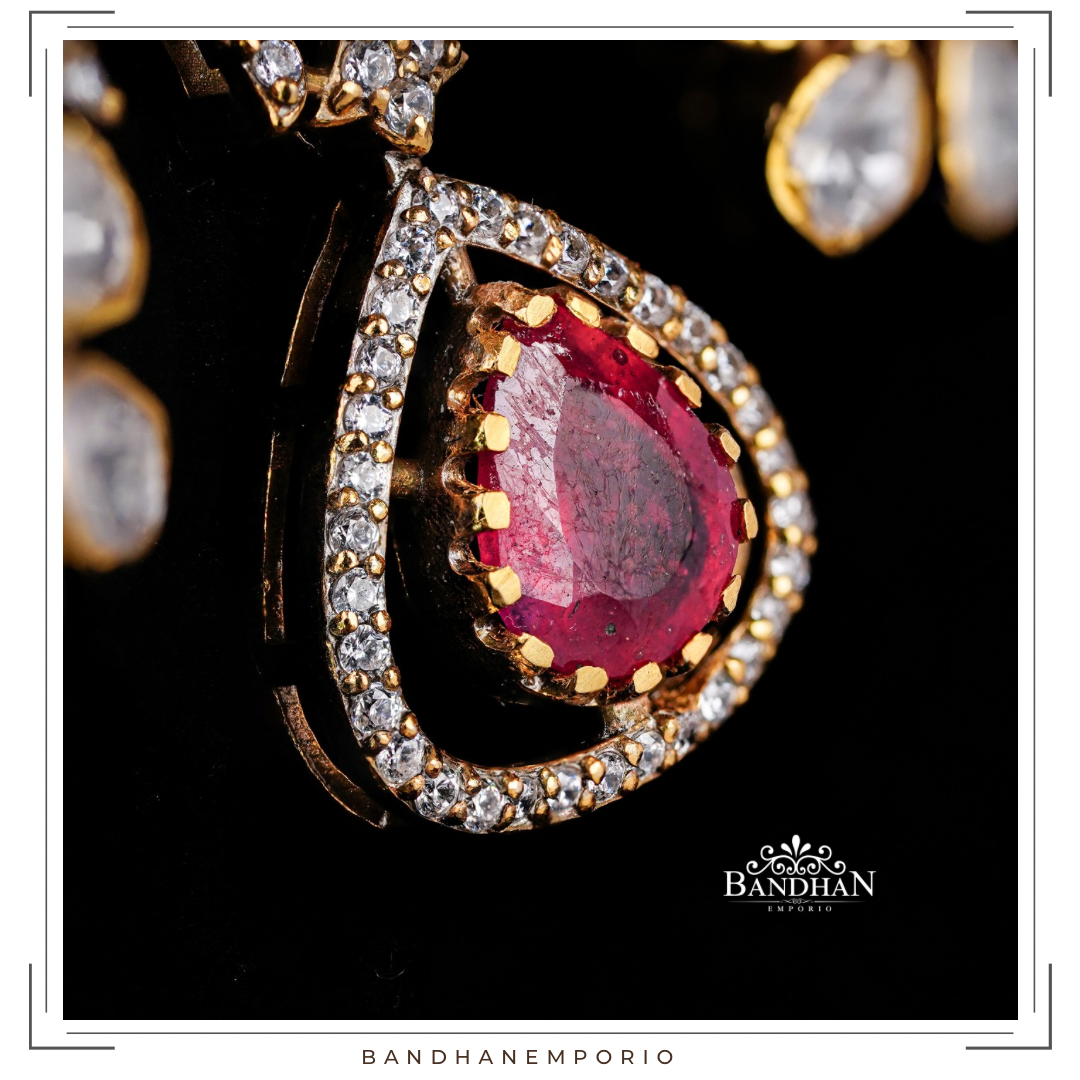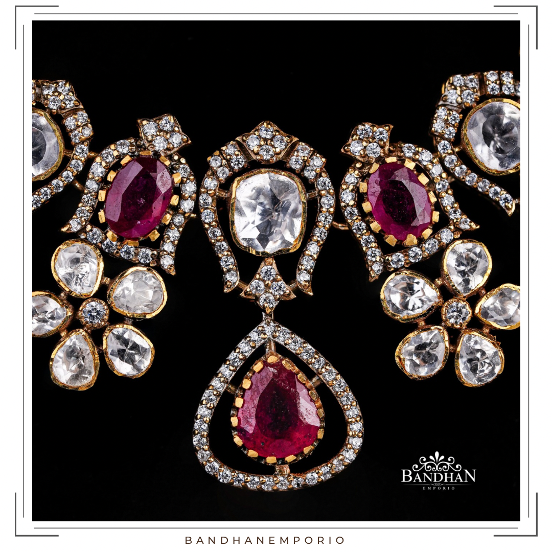 Exquisitely handcrafted Pure Sterling 92.5 Silver hallmarked, 24 gold plated, Victorian light antique finish, polki necklace studded in simulated Polki, premium certified precious natural rubies and Swarovski cubic zirconia stones. Comes with pair of matching earrings.