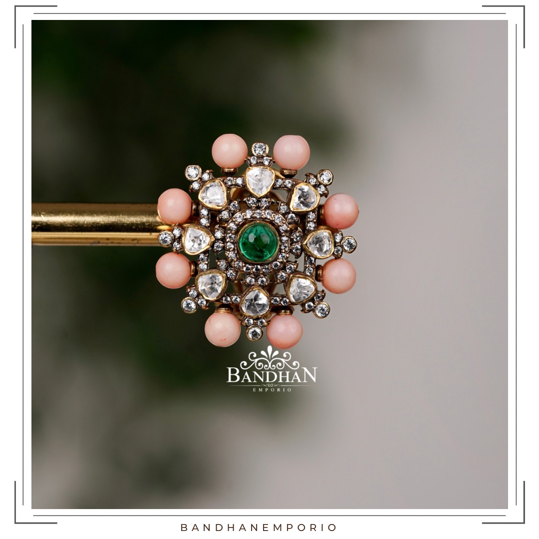 Intricate handcrafted Victorian studs, made in 92.5 Silver with 24 ct gold plating, studded with premium quality Swarovski stones, polkis and corals. Product comes with screwback and supporting clip.
