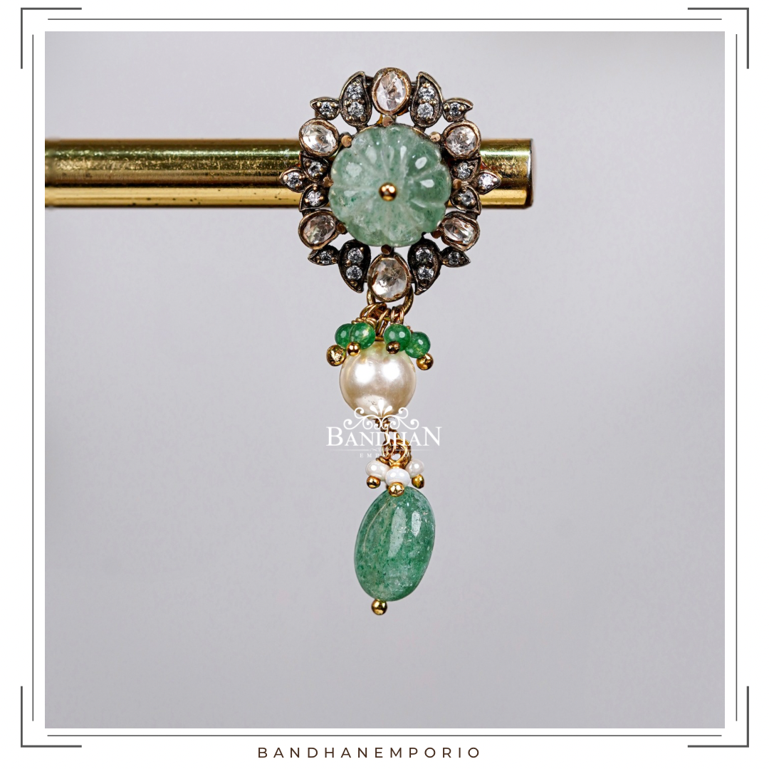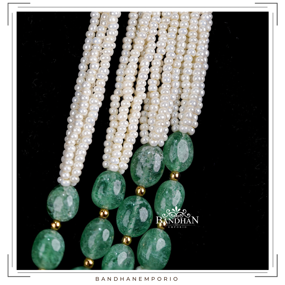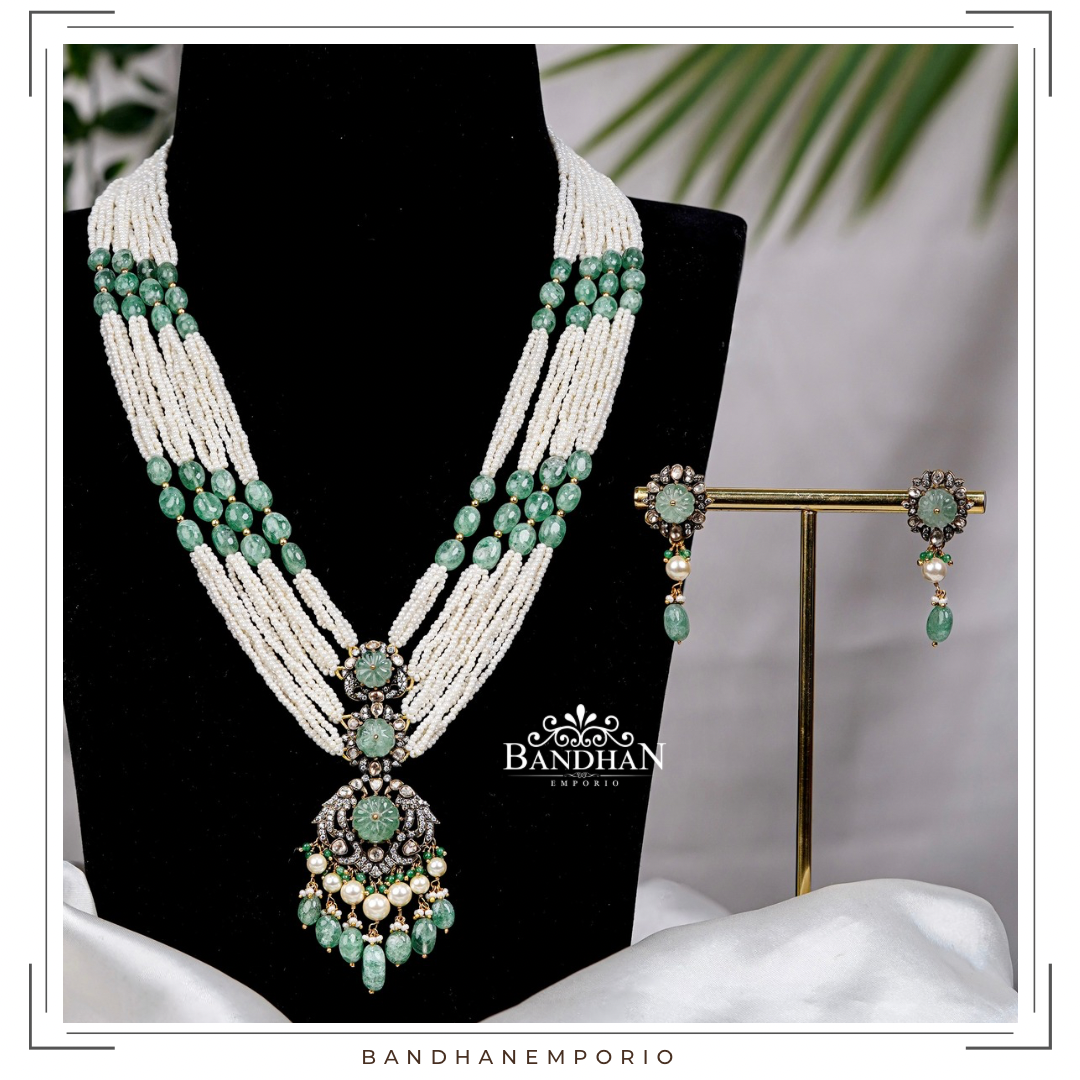 Exquisitely handcrafted Pure Sterling 92.5 Silver hallmarked, Victorian antique finish necklace set, strung in Swarovski pearls and precious emeralds, studded with premium quality cubic zirconia and simulated Polki. Comes with pair of matching earrings.