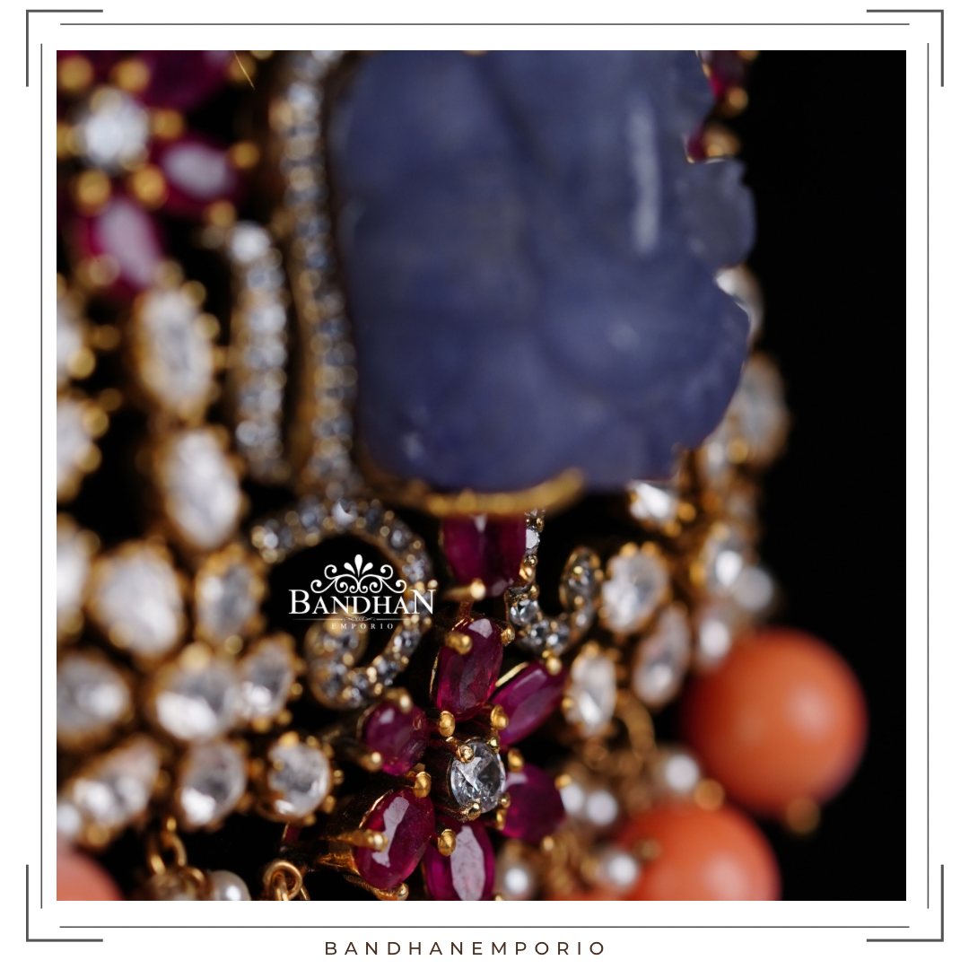Handcrafted Victorian Pendant set, 92.5 Silver Hallmarked, with 24ct gold plating, studded with premium quality cubic zirconia stones, centre carved certified natural Tanzanite, precious rubies, certified precious corals, simulated polki, strung in precious natural coralsand tanzanites. Product comes with a pair of matching earrings. Pendant is detachable.