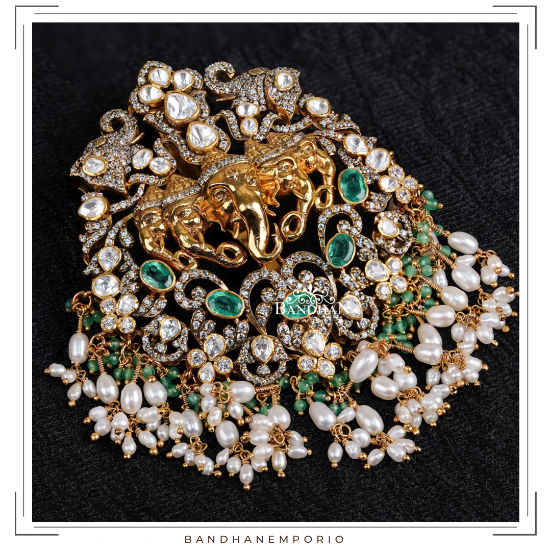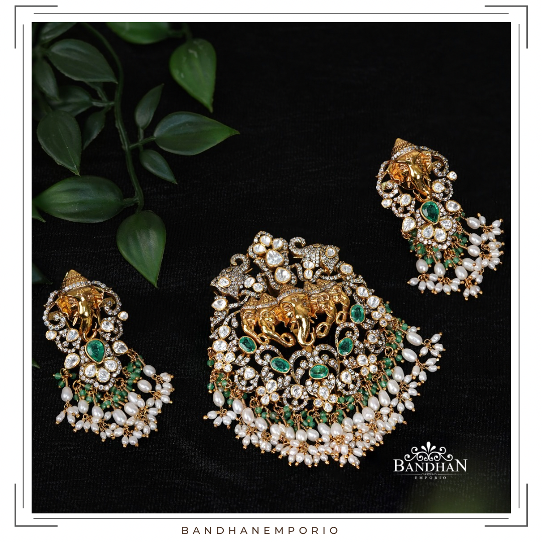 Handcrafted Victorian light antique finish, detachable Ganesh Pendant set, 92.5 Silver Hallmarked, with 24ct gold plating, studded with premium quality cubic zirconia stones, premium natural fresh water pearls. Product comes with a pair of matching earrings. Pendant is detachable.