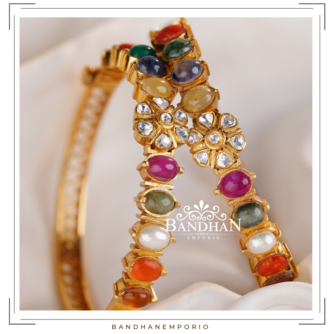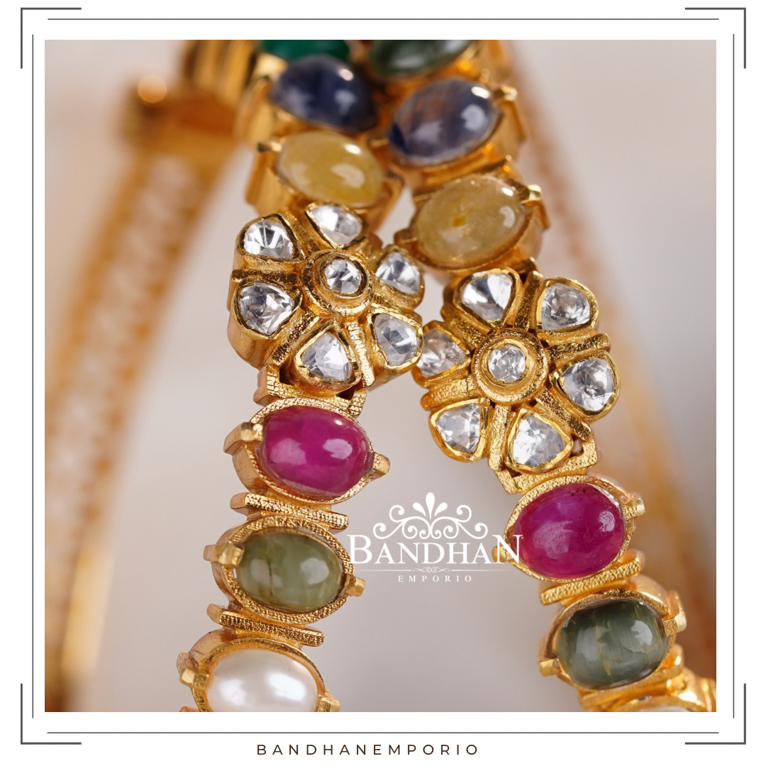 Intricately handcrafted bangles pair, made in 92.5 Silver with 24 ct gold plating, studded with premium quality simulated polki and certified navratan stones. Product comes as openable bangle.