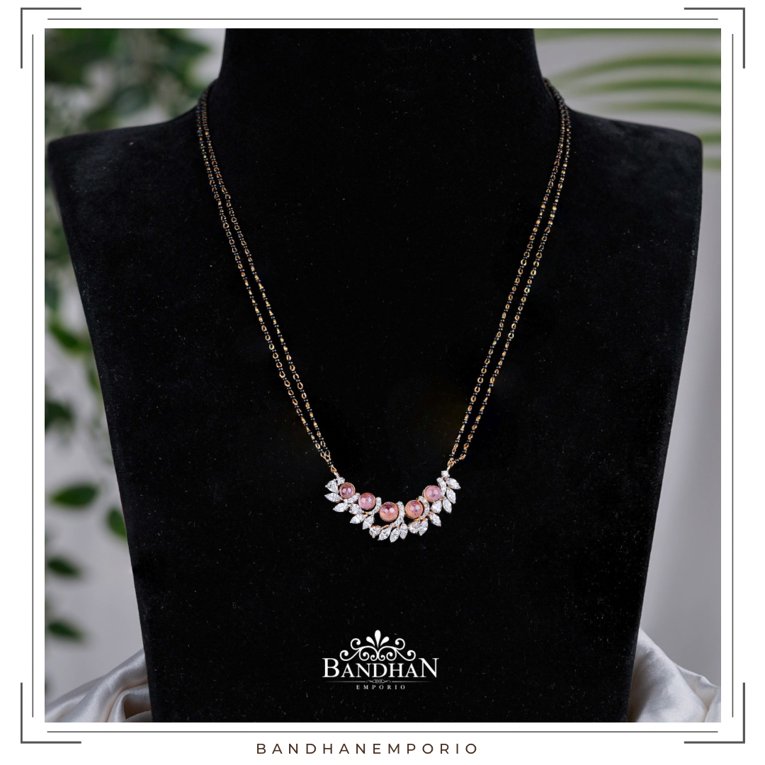 Exquisitely handcrafted Pure Sterling 92.5 Silver hallmarked, 24ct gold plated, black beads necklace, pendant studded with premium cubic zircons and premium precious rubies. (No earrings)