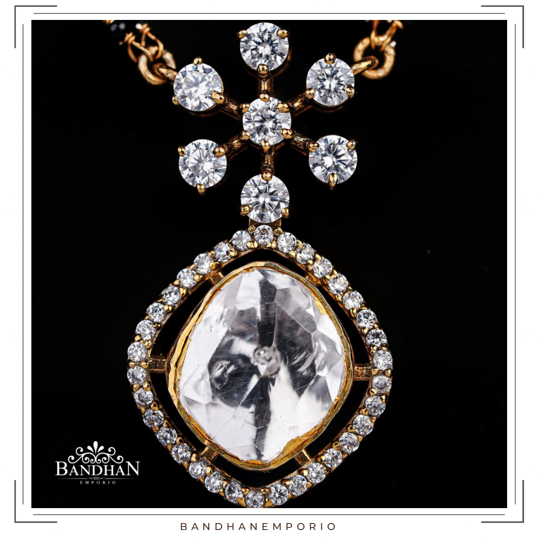 Exquisitely handcrafted Pure Sterling 92.5 Silver hallmarked, 24ct gold plated, black beads necklace with Polki pendant studded with premium cubic zircons , synthetic Polki. Product comes with matching earrings.