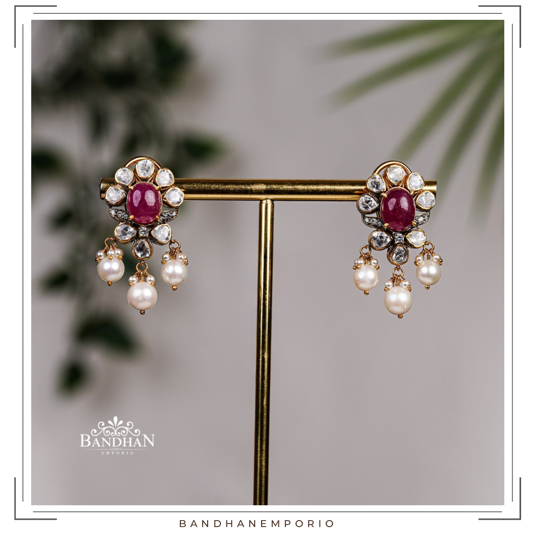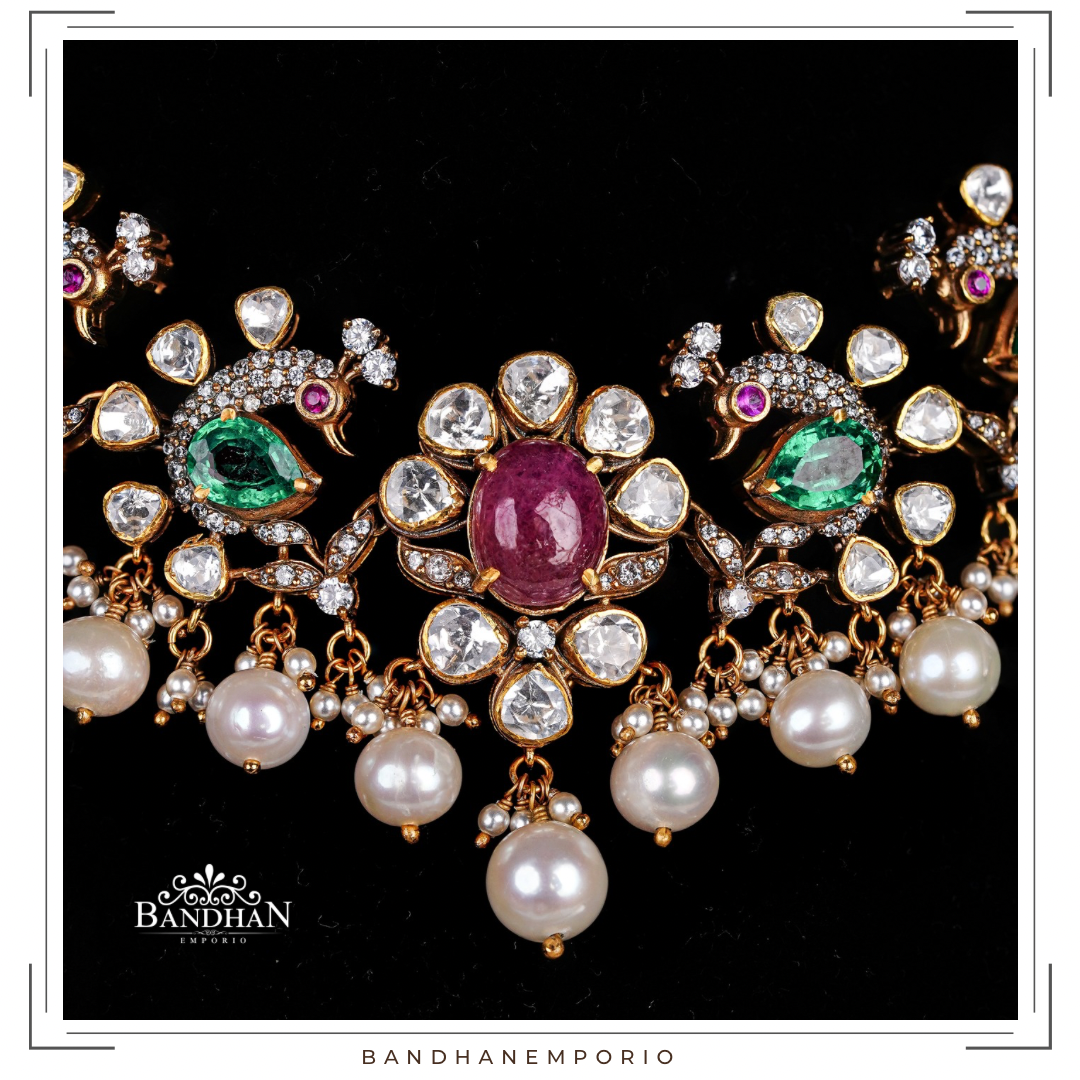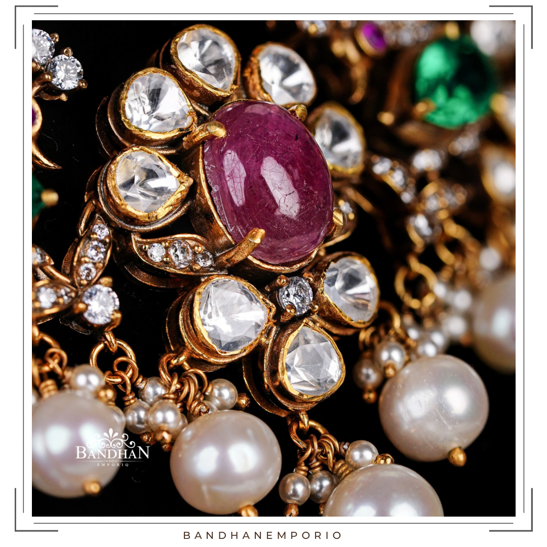 Exquisitely handcrafted Pure Sterling 92.5 Silver hallmarked, 24ct gold plated, necklace studded with lab grown Polki, premium cubic zircons , precious natural ruby, precious natural fresh water pearls and lab grown emerald. Product comes with matching earrings.
