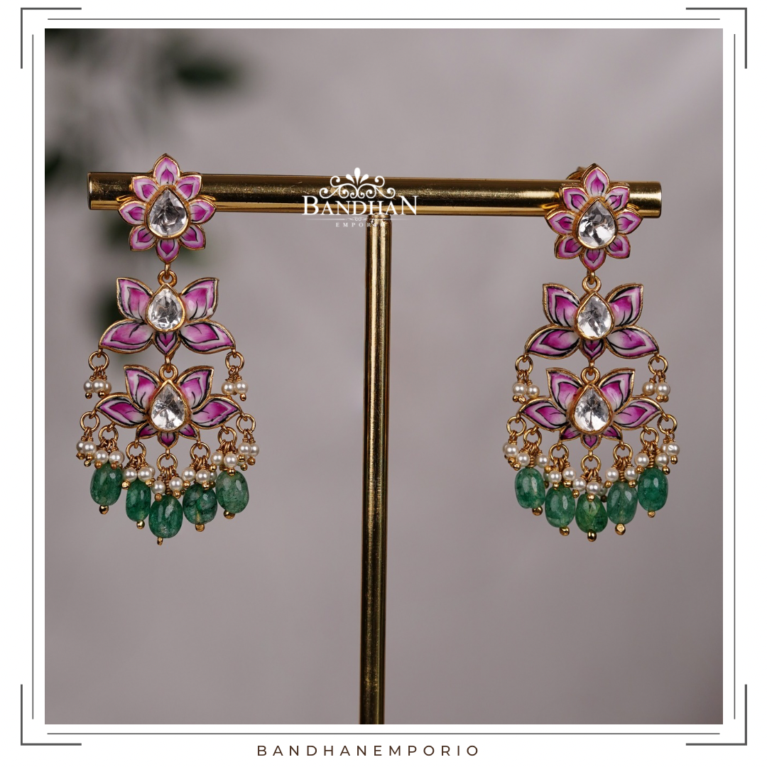 Intricately handcrafted Meenakari Chandbali, made in 92.5 Silver with 24 ct gold plating, studded with premium quality simulated Polki stones, precious freshwater pearls, premium precious natural emeralds. Product comes with screwback and supporting clip