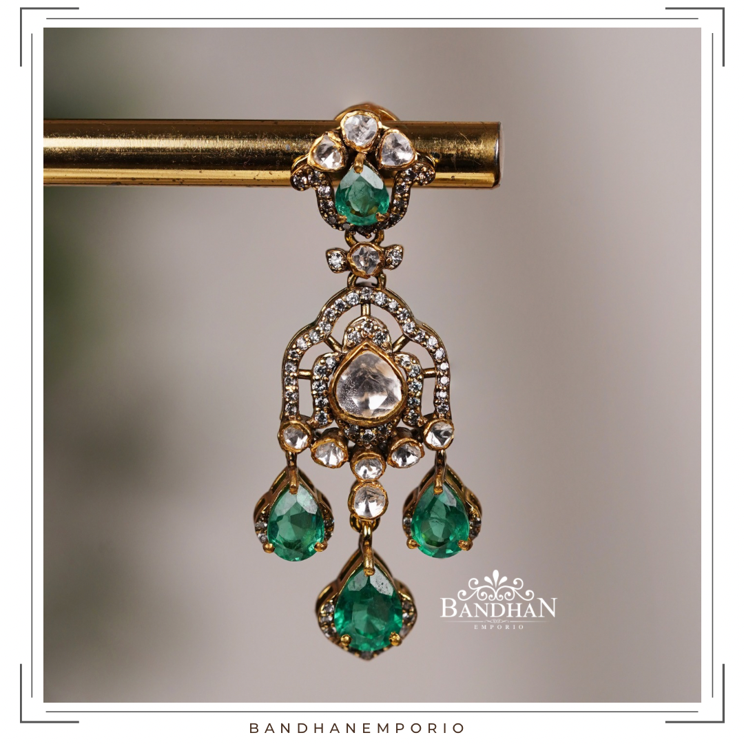 Intricately handcrafted Chandbali, made in 92.5 Silver with 24 ct gold plating, studded with premium quality simulated Polki stones and premium lab grown emerald. Product comes with screwback.