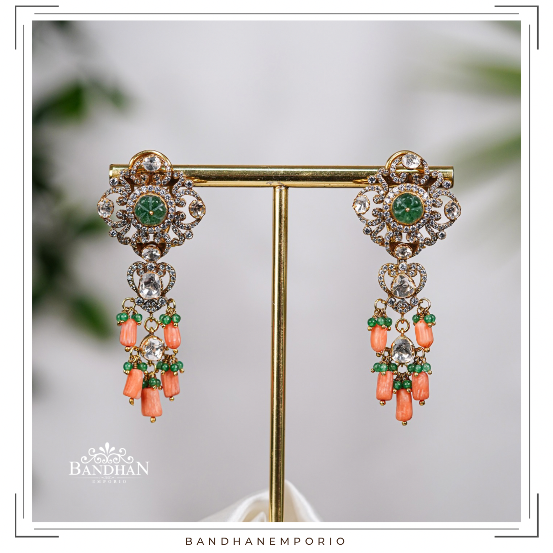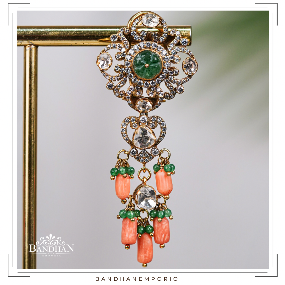 Intricately handcrafted Chandbali, made in 92.5 Silver with 24 ct gold plating, studded with premium quality simulated Polki stones, precious corals and precious emerald. Product comes with screwback and supporting clip.