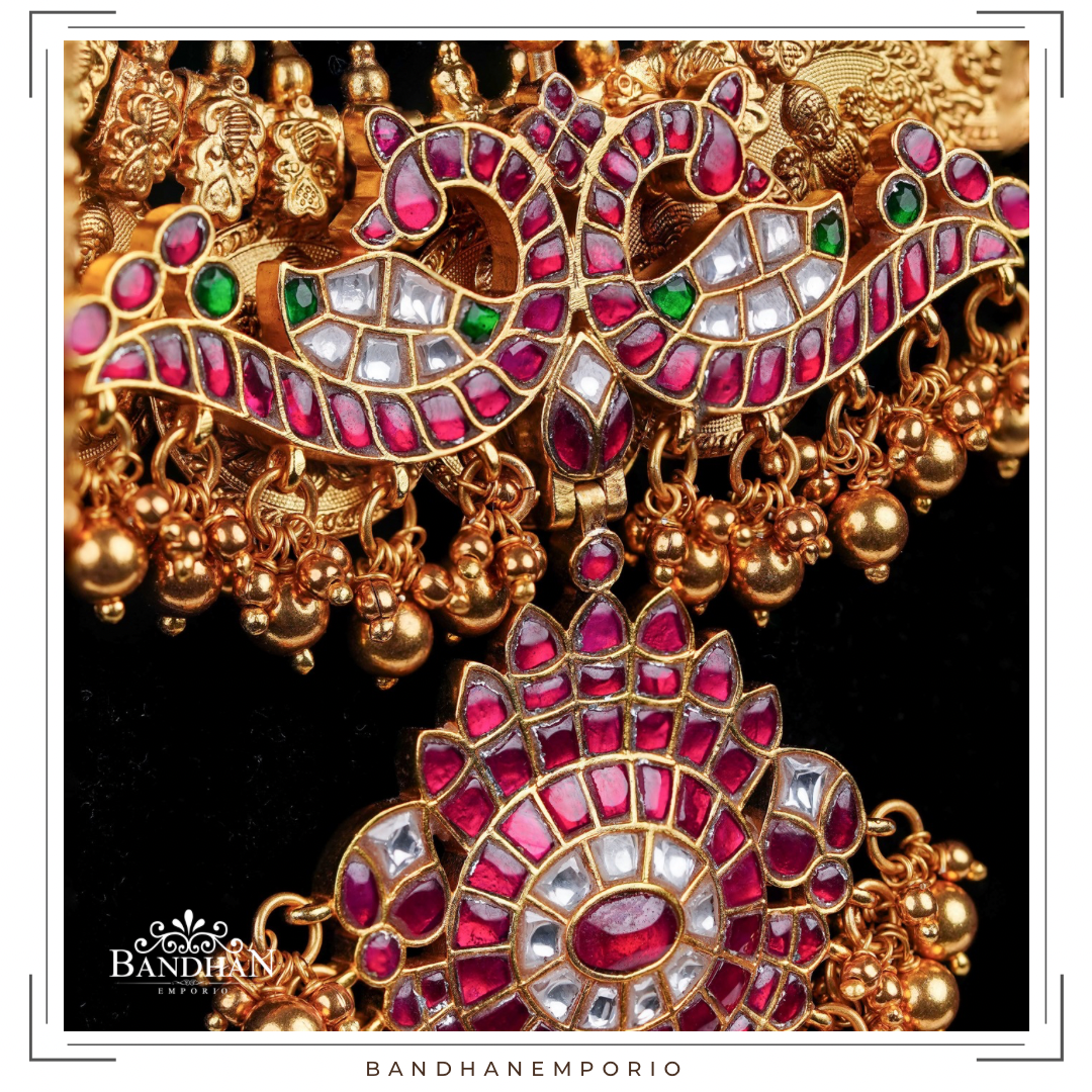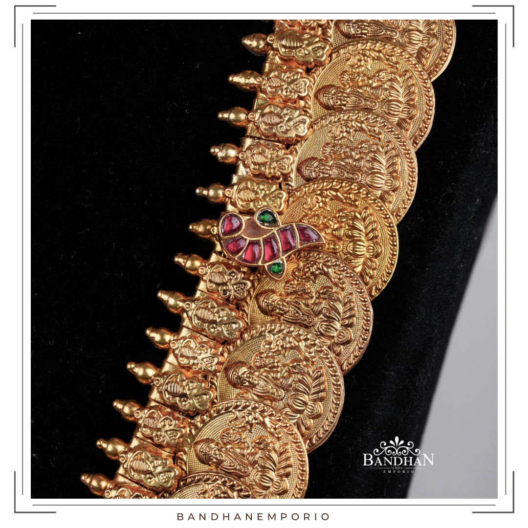 Exquisitely handcrafted Pure Sterling 92.5 Silver hallmarked, 24ct gold plated, light antique finished Goddess Lakshmi coin (Kasu) necklace, with brooch and pendant studded with premium kundan stones.