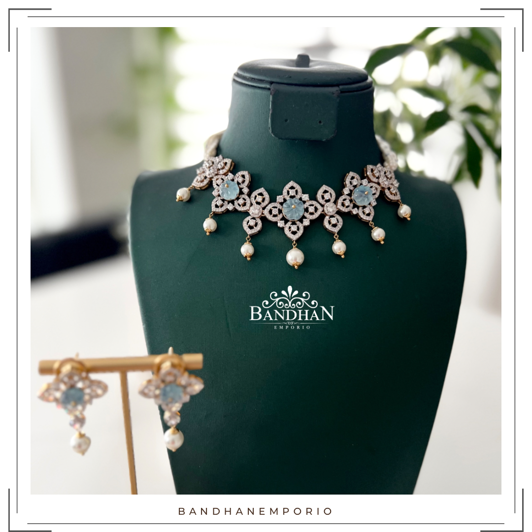 Exquisitely handcrafted Pure Sterling 92.5 Silver hallmarked, Diamond Finish necklace set studded with premium quality cubic zirconia, real aqua marine melon beads and embellished with pearls. Comes with pair of matching earrings.