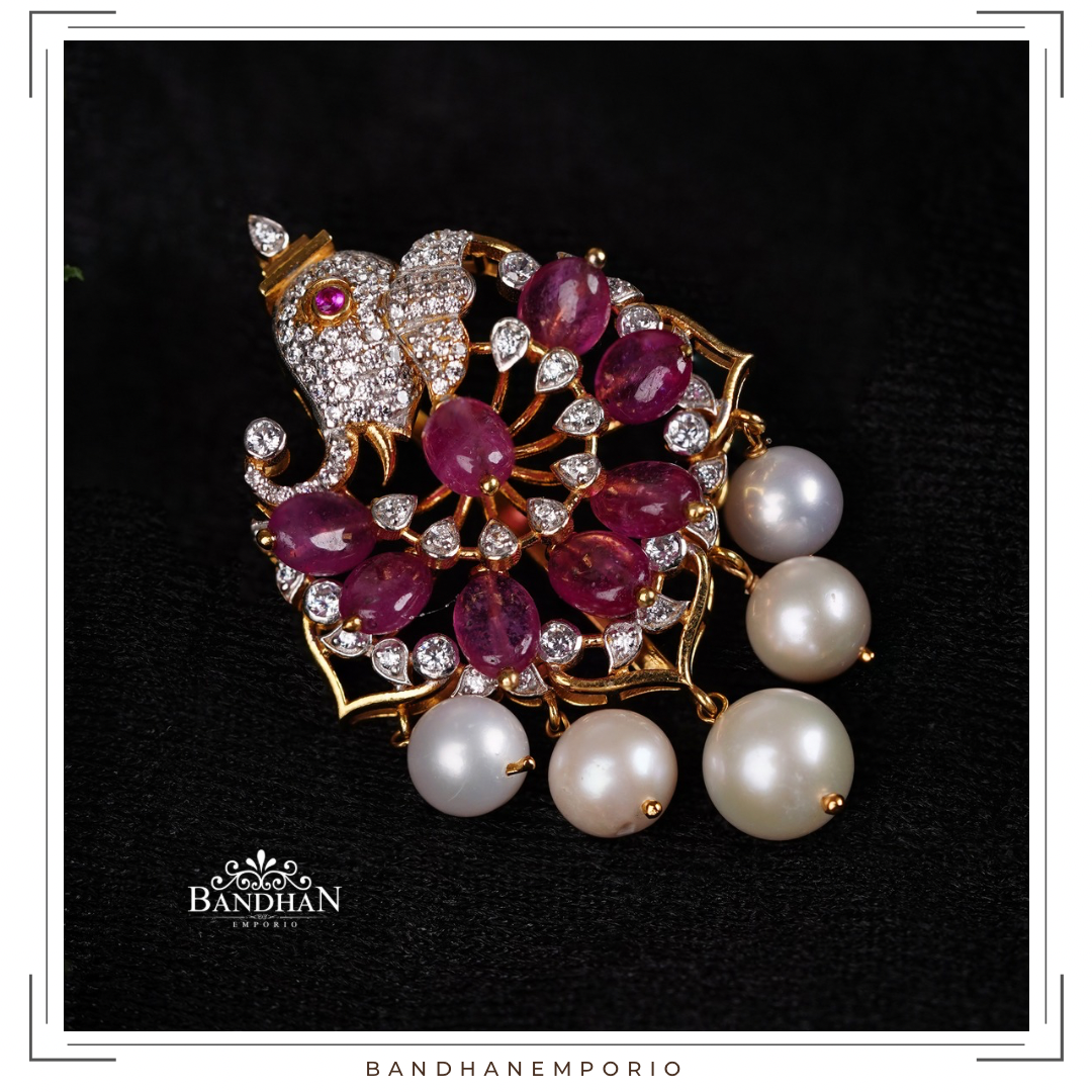 Handcrafted, diamond look alike, detachable Pendant cum brooch, 92.5 Silver Hallmarked, with 24ct gold plating, studded with premium quality cubic zirconia stones, precious certified natural rubies and precious certified natural fresh water pearls. Pendant is detachable and can be used as men brooch as well. Can also be paired with black beads.