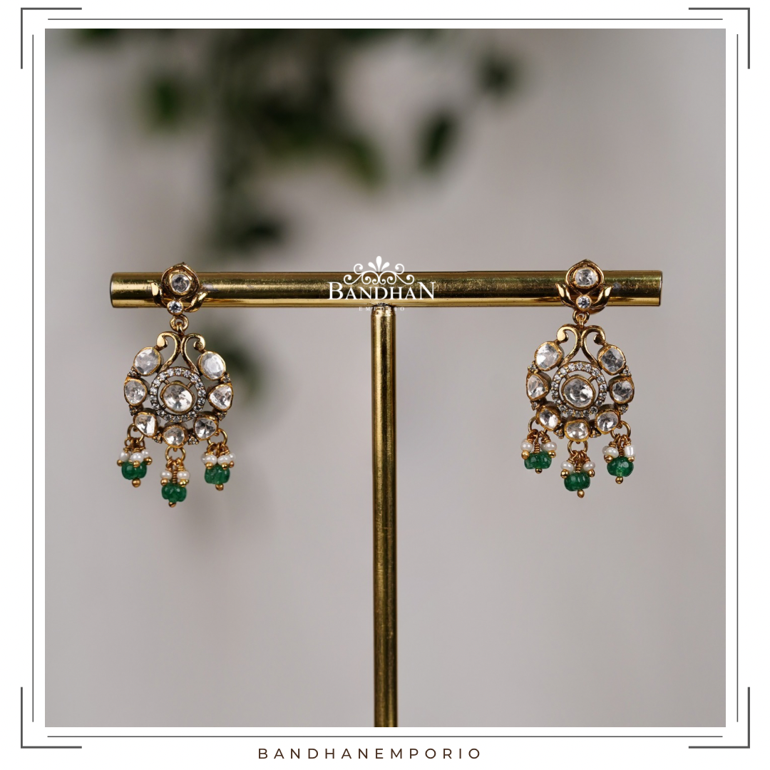 Exquisitely handcrafted Pure Sterling 92.5 Silver hallmarked, Victorian light antique finish, layered necklace, studded with simulated Polki, strung in precious natural carved Aventurine and natural fresh water pearls.
