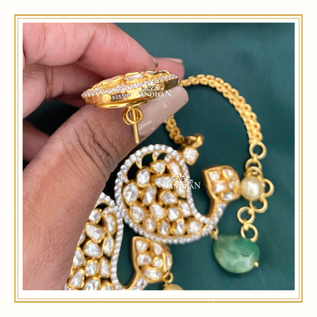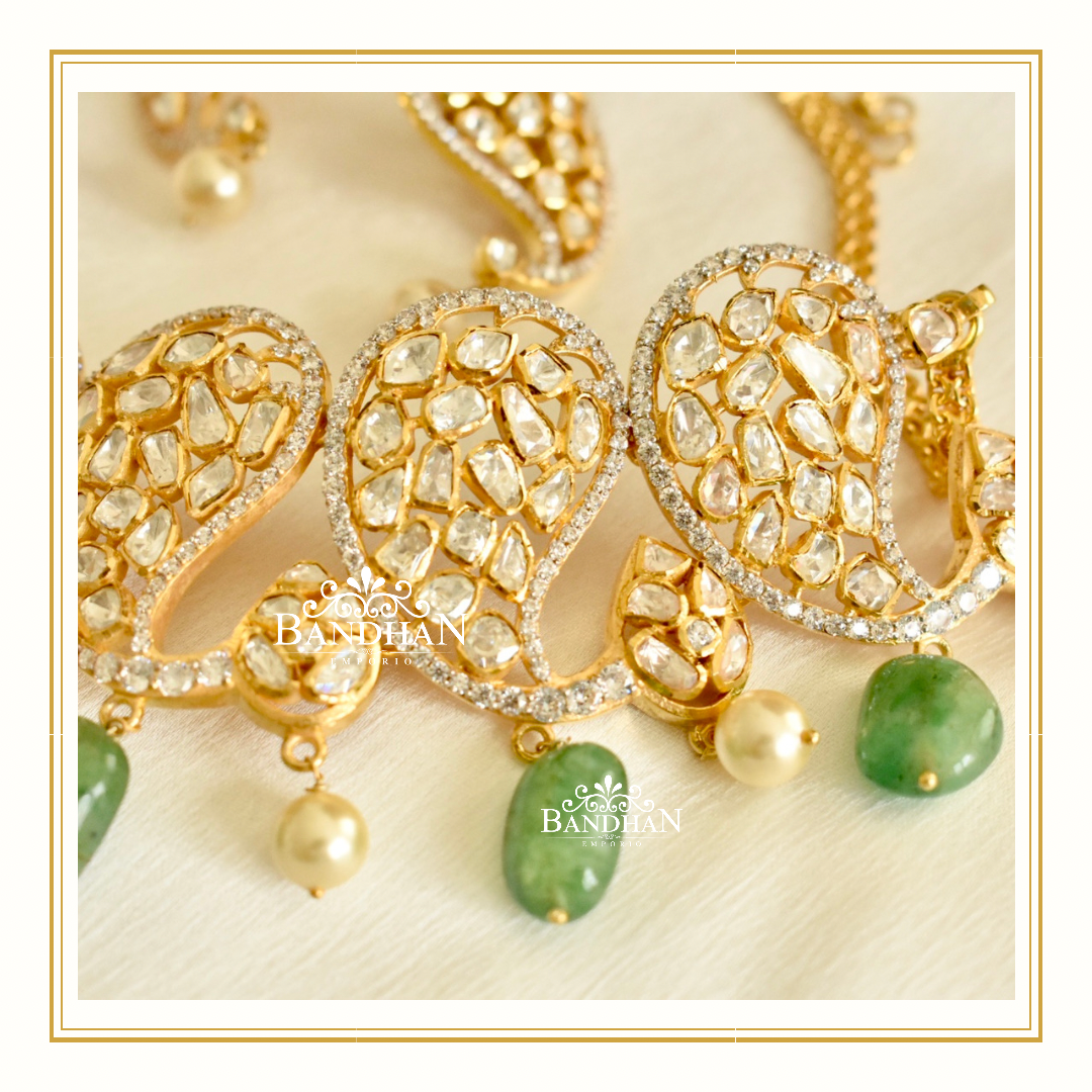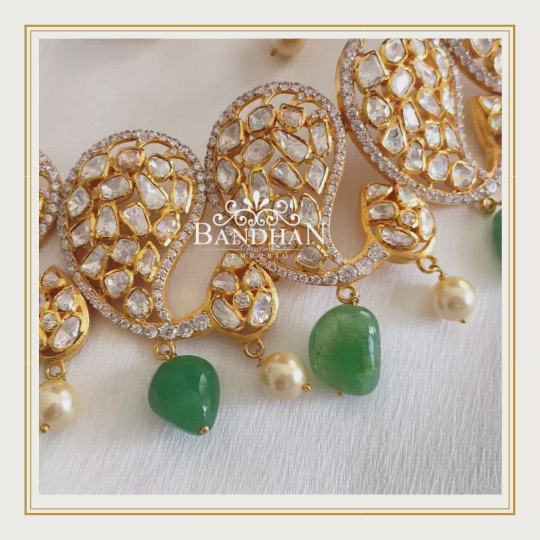 Handcrafted Paisley Polki Choker made in 92.5 Silver with 24ct gold plating, embellished with certified Emeralds and Swarovski pearls, comes with a pair of matching earrings.