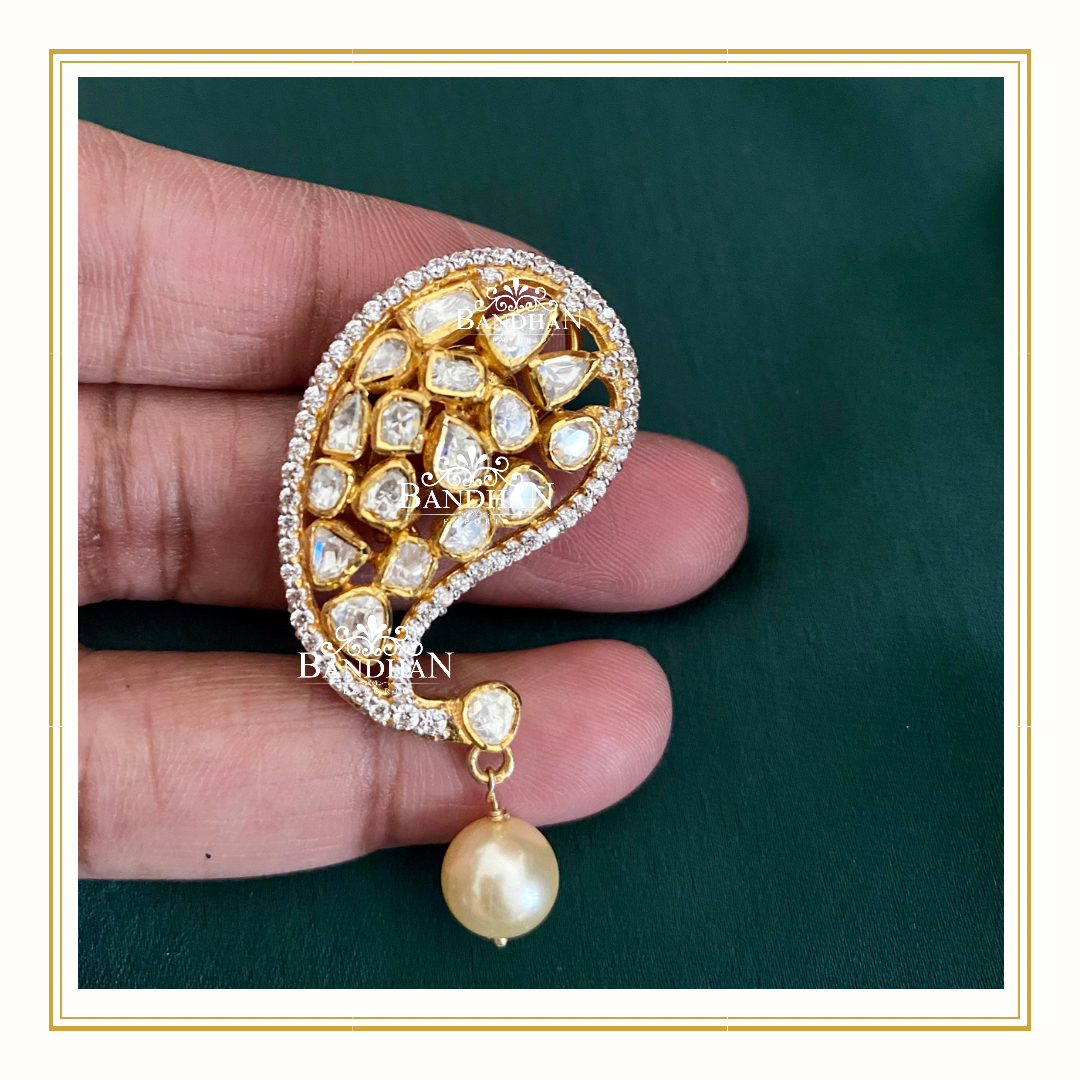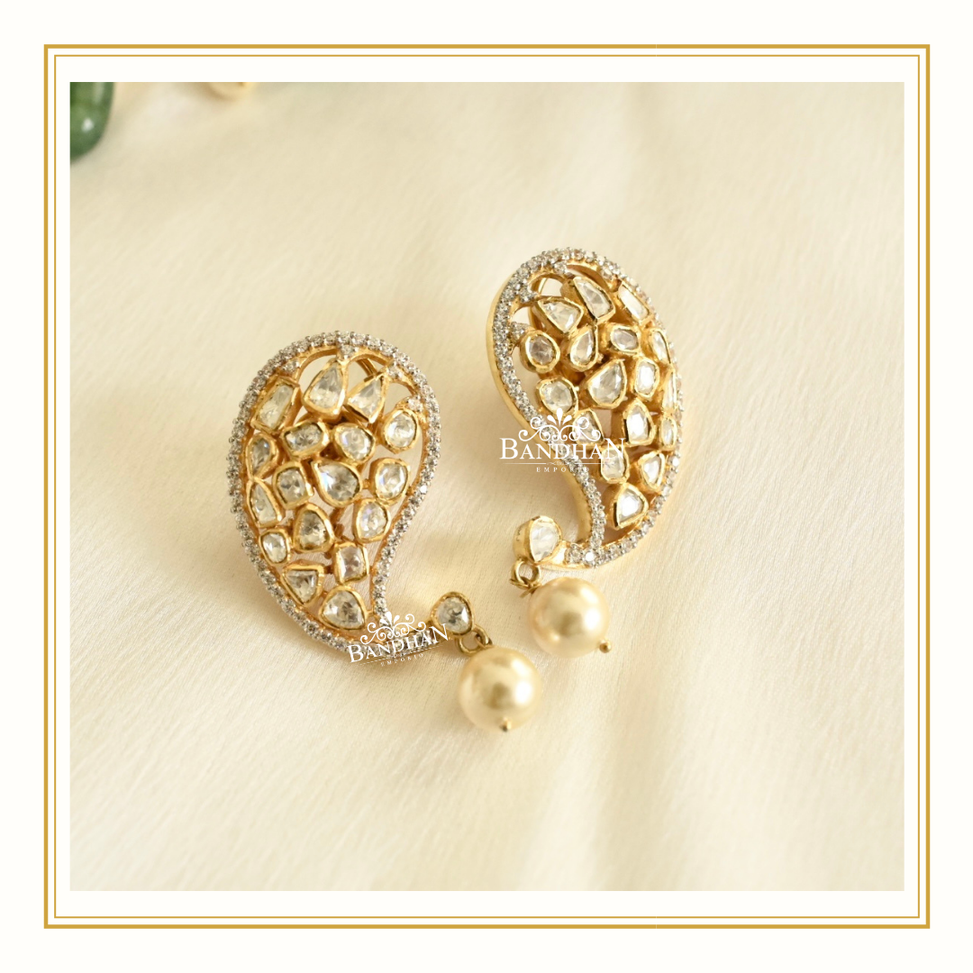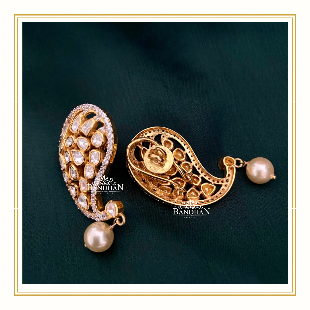 Handcrafted Paisley Polki Choker made in 92.5 Silver with 24ct gold plating, embellished with certified Emeralds and Swarovski pearls, comes with a pair of matching earrings.