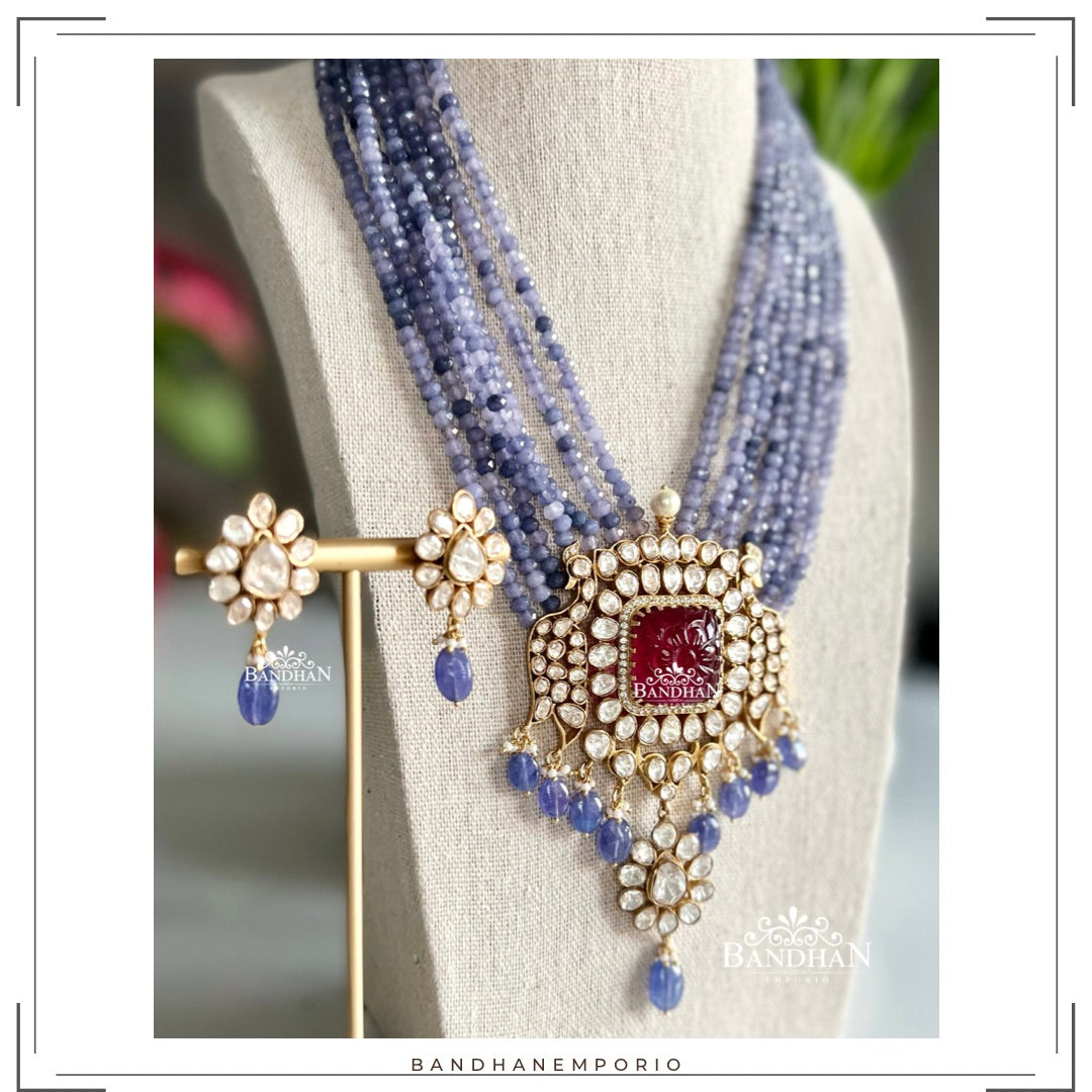 Exquisitely handcrafted Pure Sterling 92.5 Silver Beaded polki Necklace, with centre premium quality carved natural Ruby, strung in premium quality precious natural tanzanite. Comes with matching earrings.