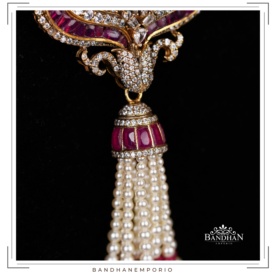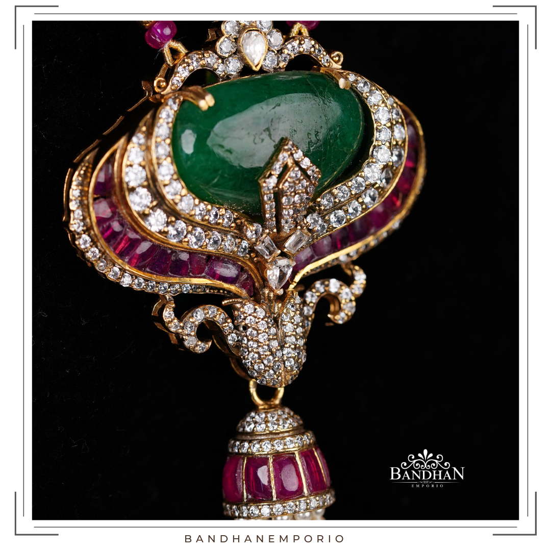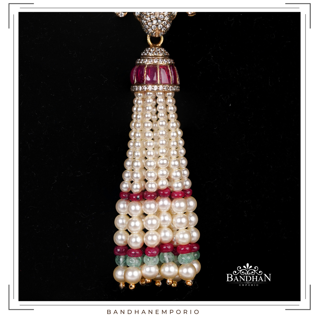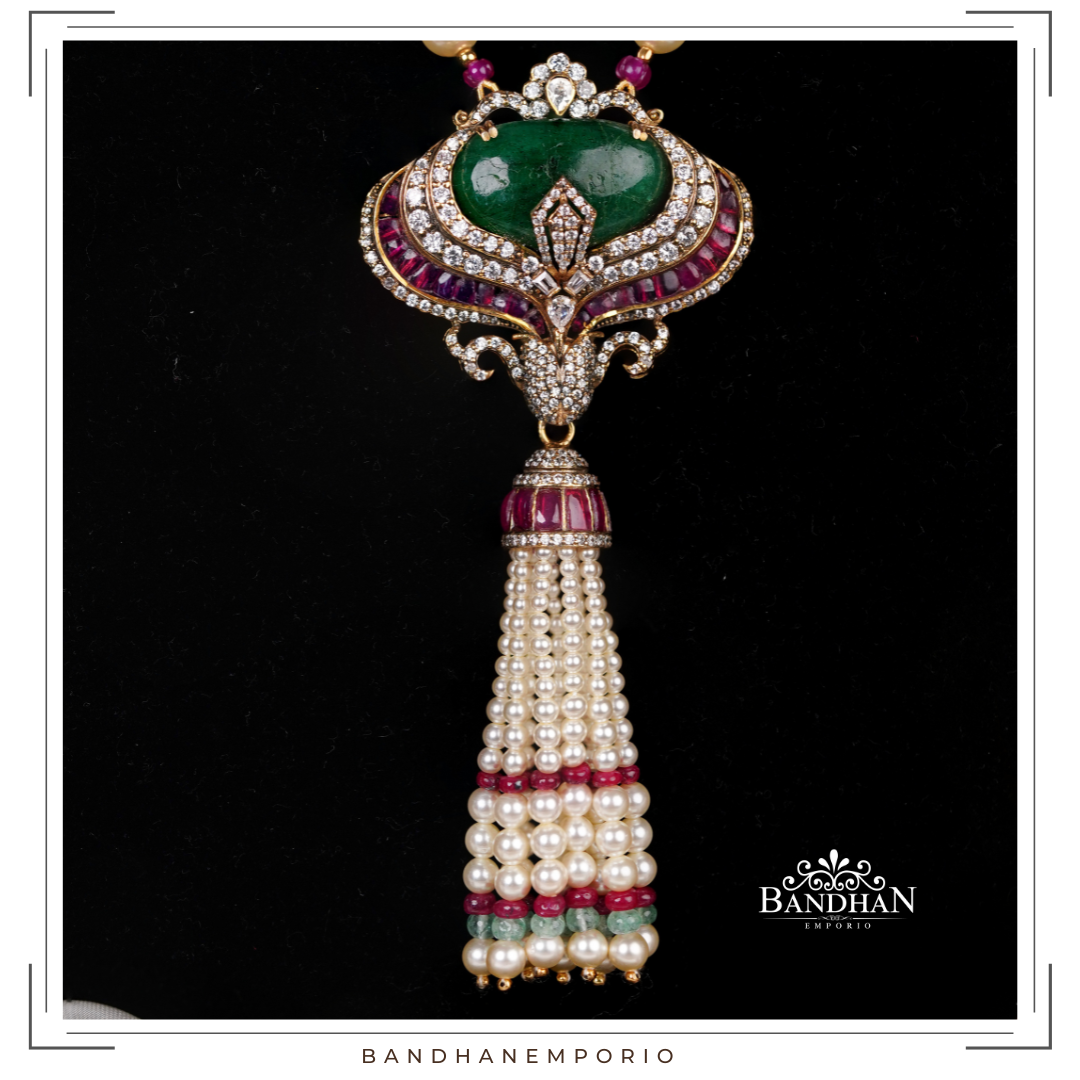Exquisitely handcrafted Pure Sterling 92.5 Silver hallmarked, 24ct gold plated, Victorian light antique finish, necklace, pendant studded with premium cubic zircons , synthetic Polki, certified precious emerald, precious Rubies and precious fresh water pearls. Tassels and chain Strung in precious fresh water pearls, carved ruby melon and precious emerald. (No Earrings)
