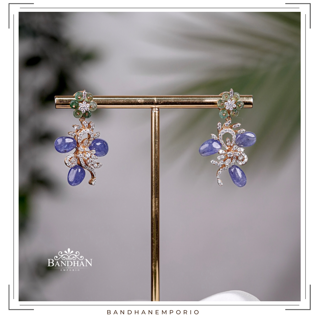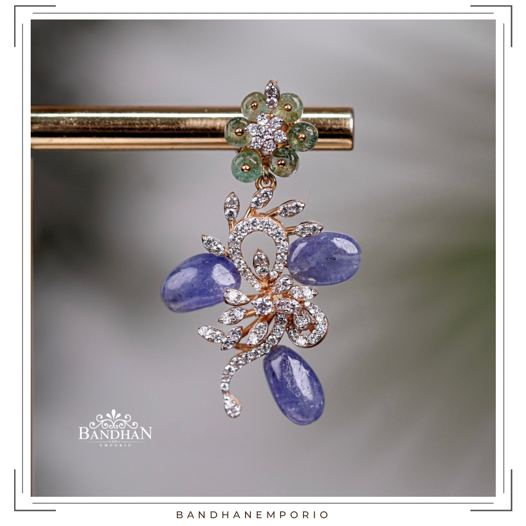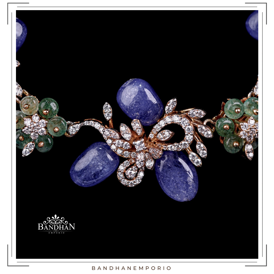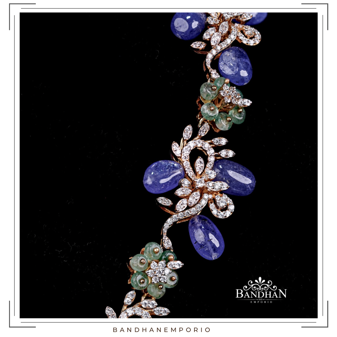 Exquisitely handcrafted Pure Sterling 92.5 Silver hallmarked, 24ct gold plated, diamond look alike necklace studded with, premium cubic zircons , precious natural tanzanites, precious natural emeralds. Product comes with matching earrings.