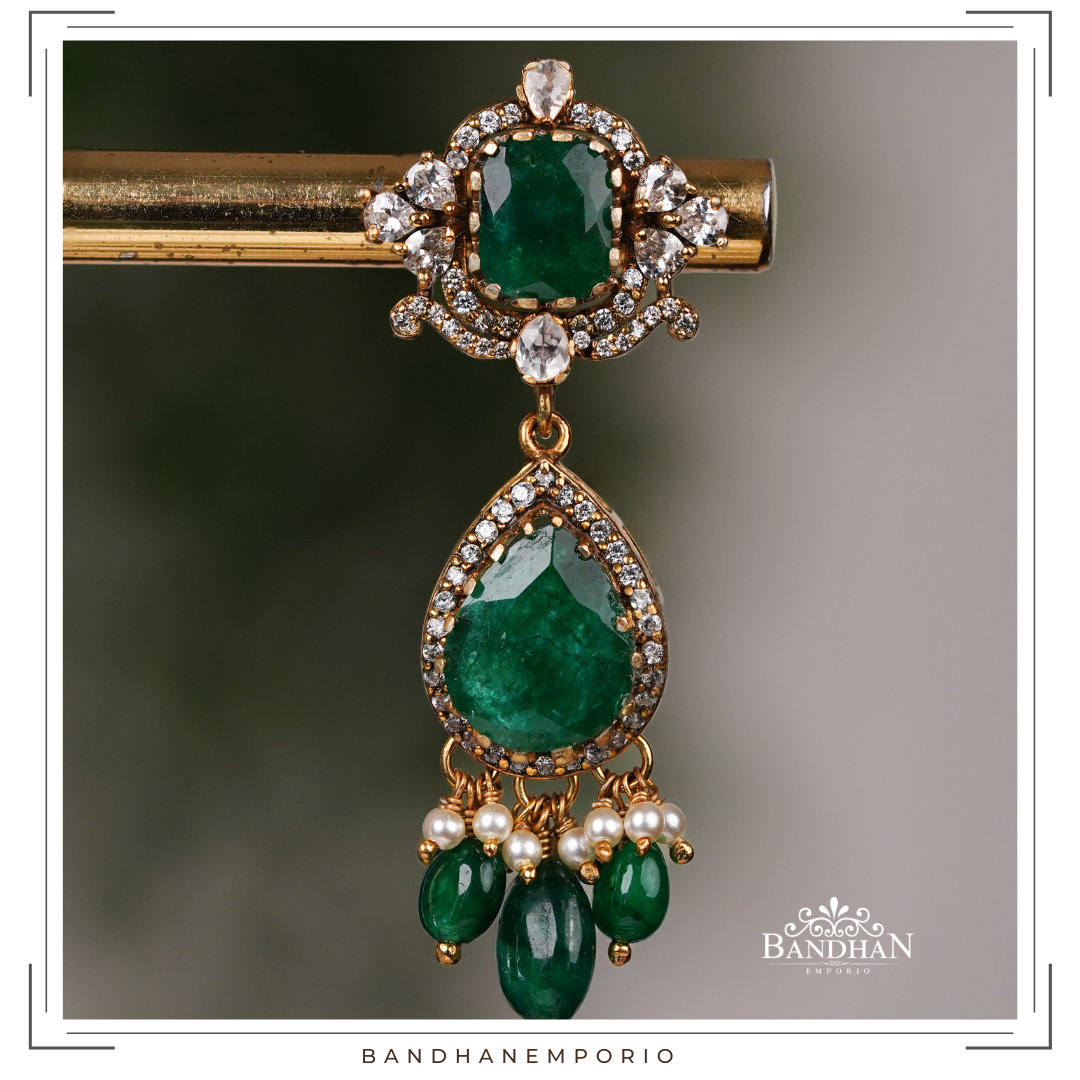 Exquisitely handcrafted Pure Sterling 92.5 Silver hallmarked, 24ct gold plated, light antique finished necklace studded with, premium cubic zircons , precious natural emeralds, precious rubies and precious freshwater pearls. Product comes with matching earrings.