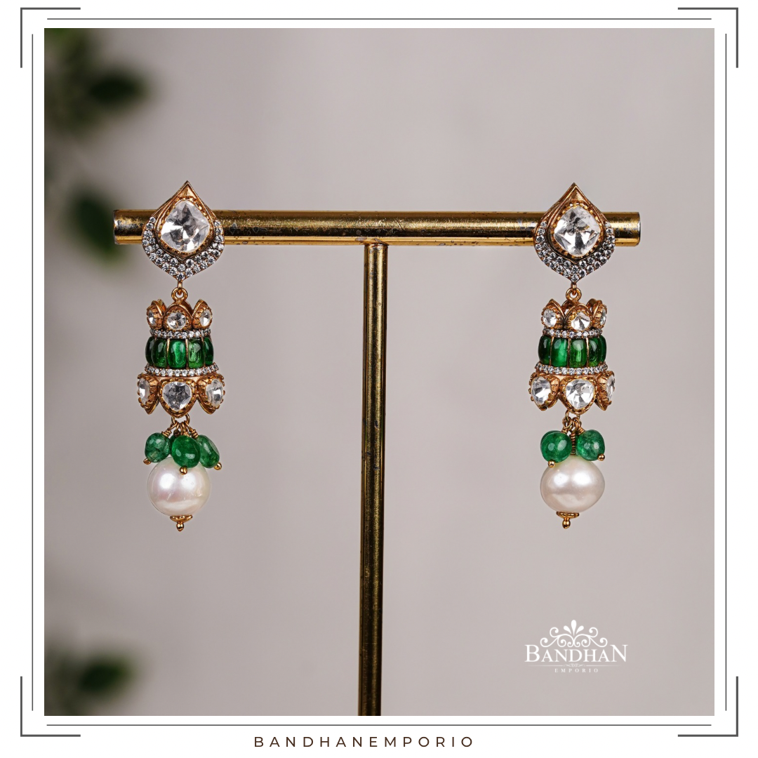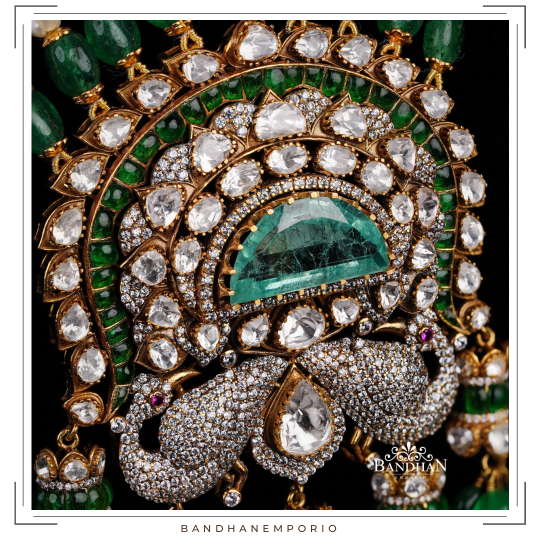 Exquisitely handcrafted Pure 92.5 Silver hallmarked necklace set, 24ct gold plated, light antique finish, pendant handcraftes with peacock motifs. studded with lab grown Russian emerald, premium cubic zircons, strung in precious natural fresh water pearls, lab grown Polkis and precious emeralds. Comes with pair of matching earrings, with screwback and supporting clip and adjustable back chain