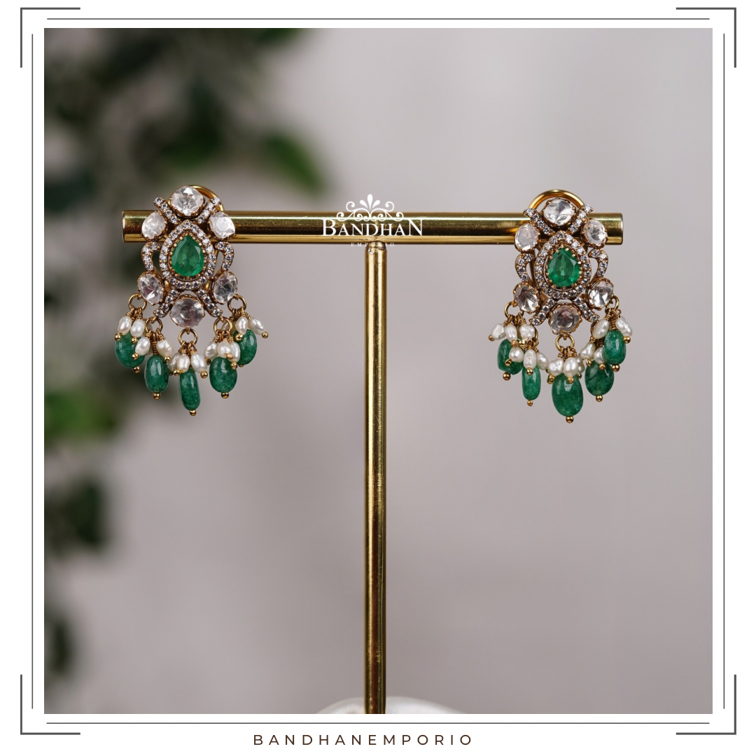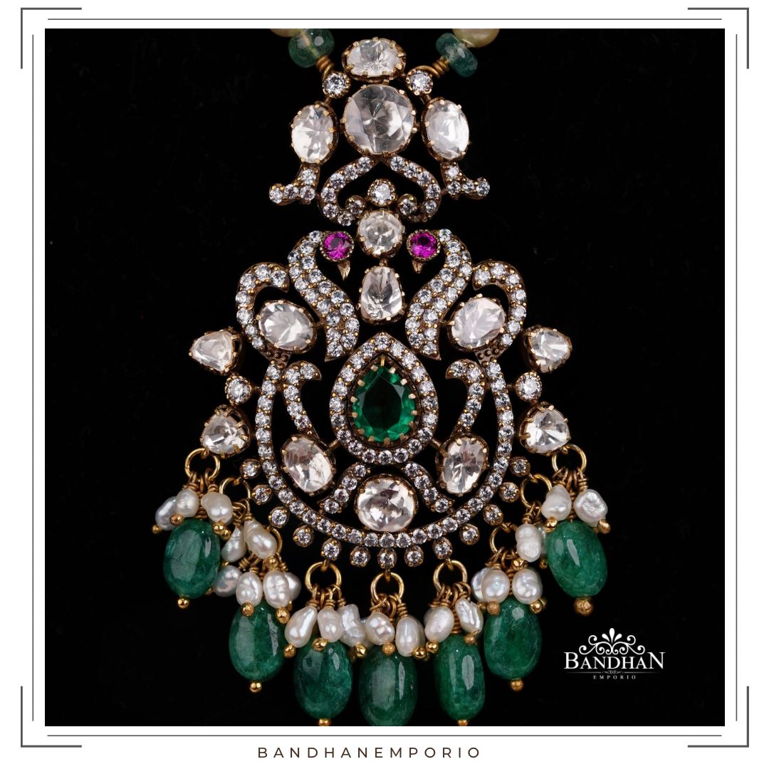 Handcrafted, light antique finish, Pendant set, 92.5 Silver Hallmarked, with 24ct gold plating, studded with premium quality cubic zirconia stones, simulated Polki, strung in certified precious emeralds and precious fresh water pearls.