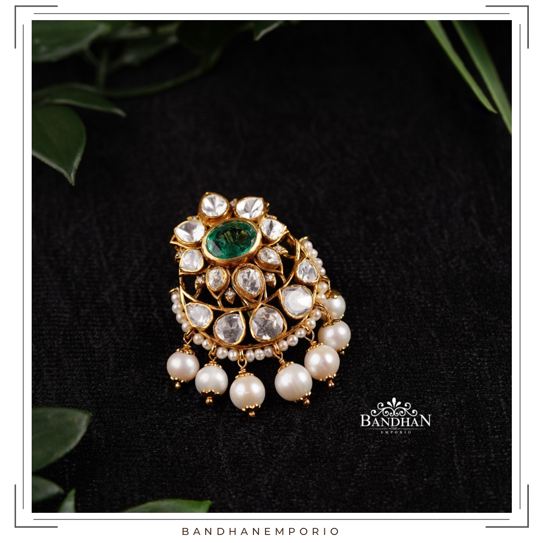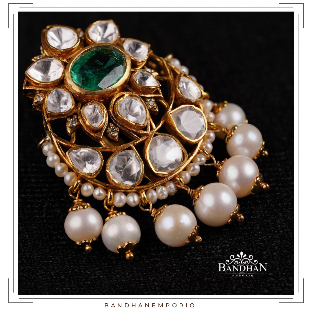 Handcrafted, light antique finish, detachable Pendant set, 92.5 Silver Hallmarked, with 24ct gold plating, studded with premium quality cubic zirconia stones, simulated Polki, certified precious natural fresh water pearls and lab grown emeralds. Pendant is detachable. Can be paired with black beads.