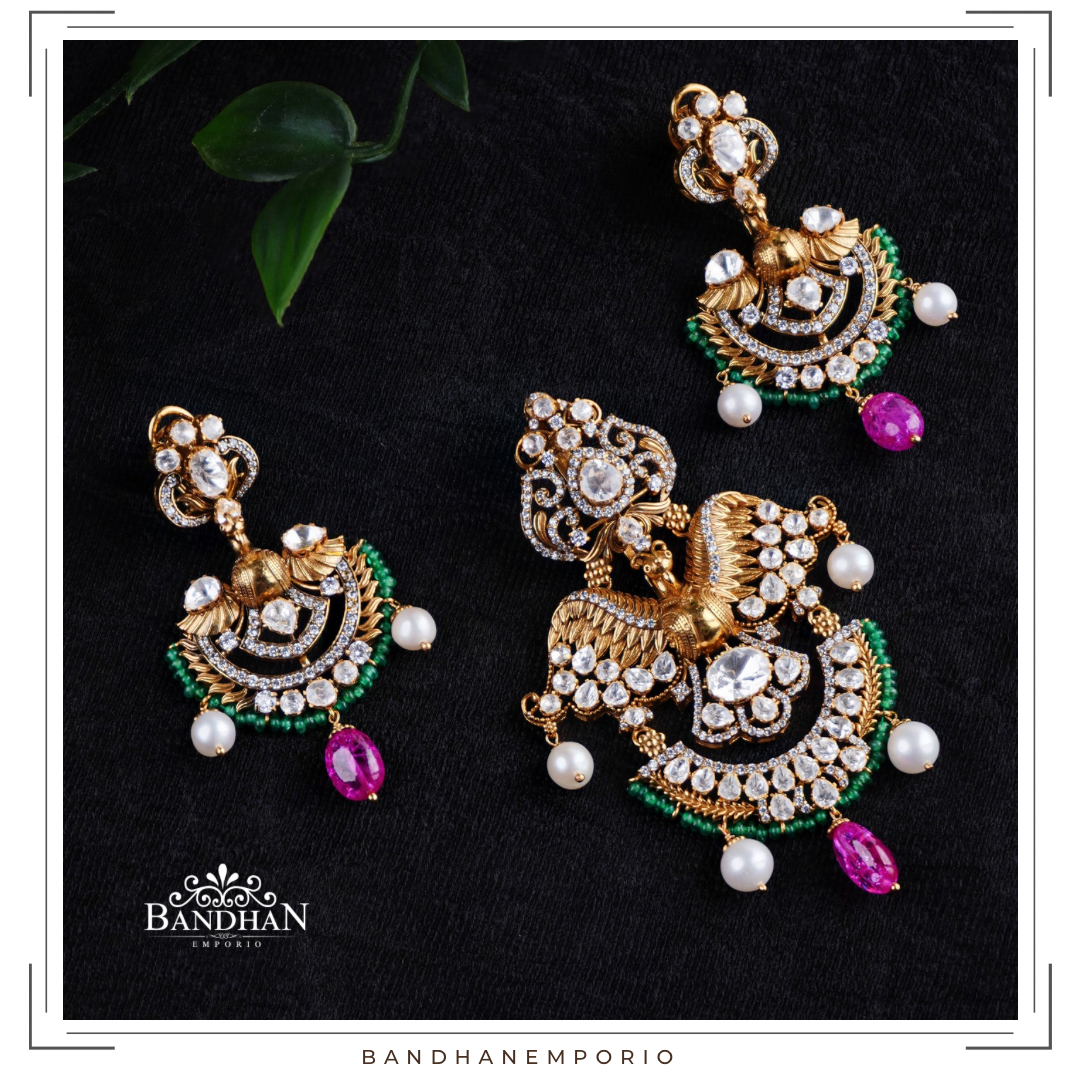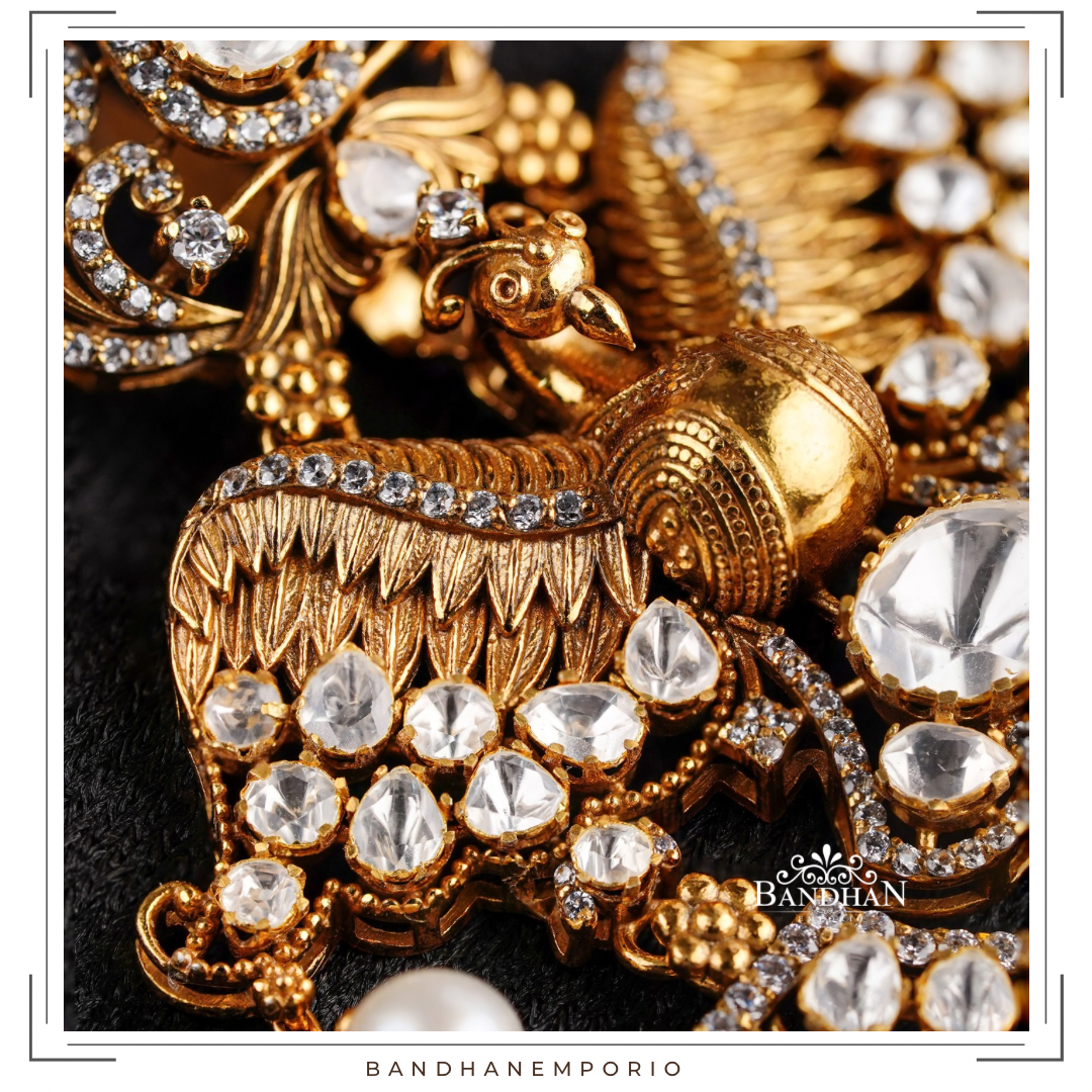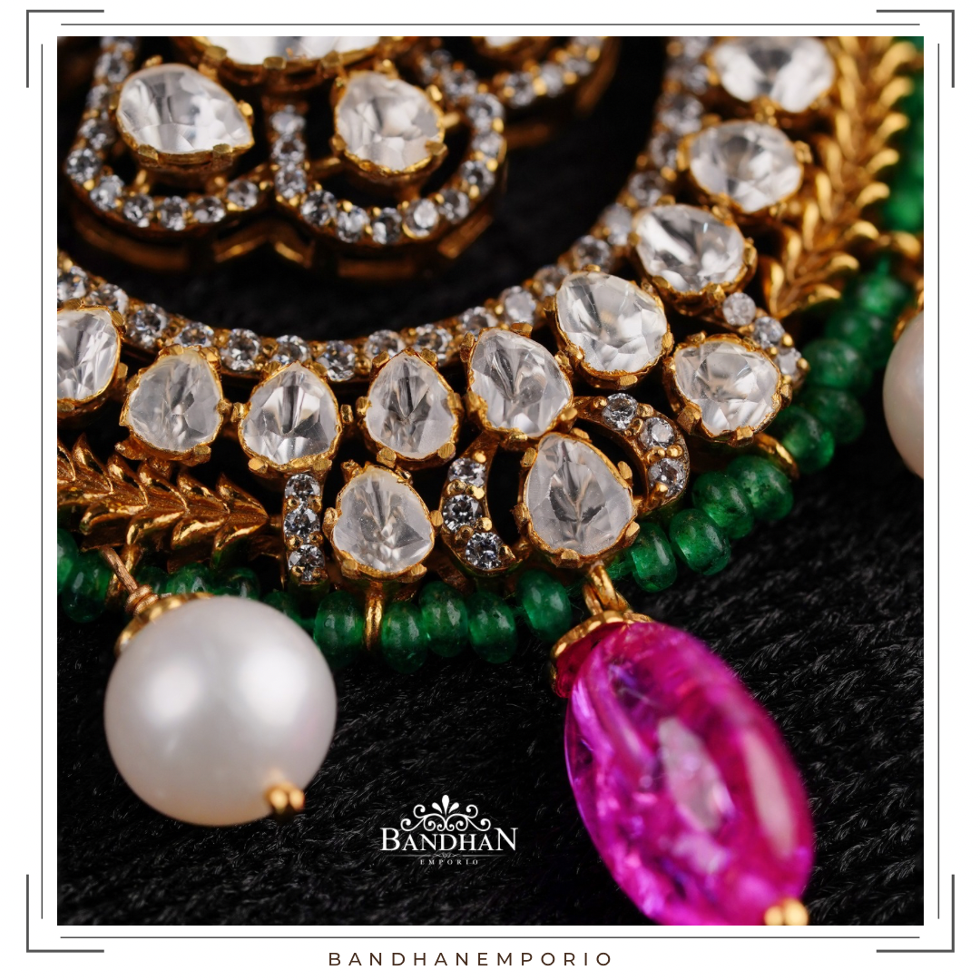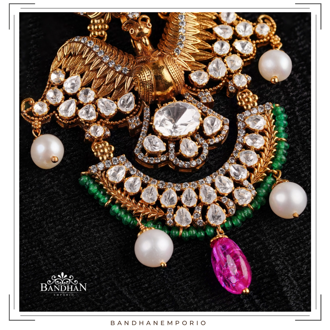 Handcrafted, light antique finished Pendant set, 92.5 Silver Hallmarked, with 24ct gold plating, studded with premium quality cubic zirconia stones, lab grown polkis, precious fresh water pearls, precious rubies and precious emeralds. Pendant is detachable. Product comes with pair of matching earrings, with screwback and supporting clip.