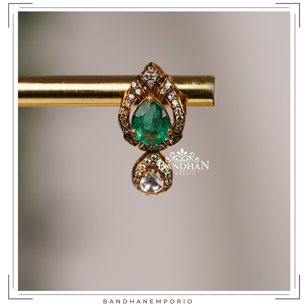 Handcrafted Victorian light antique finish, detachable Ganesh Pendant set, 92.5 Silver Hallmarked, with 24ct gold plating, studded with premium synthetic polkis, premium quality cubic zirconia stones, certified natural emerald. Product comes with a pair of matching earrings. Pendant is detachable.