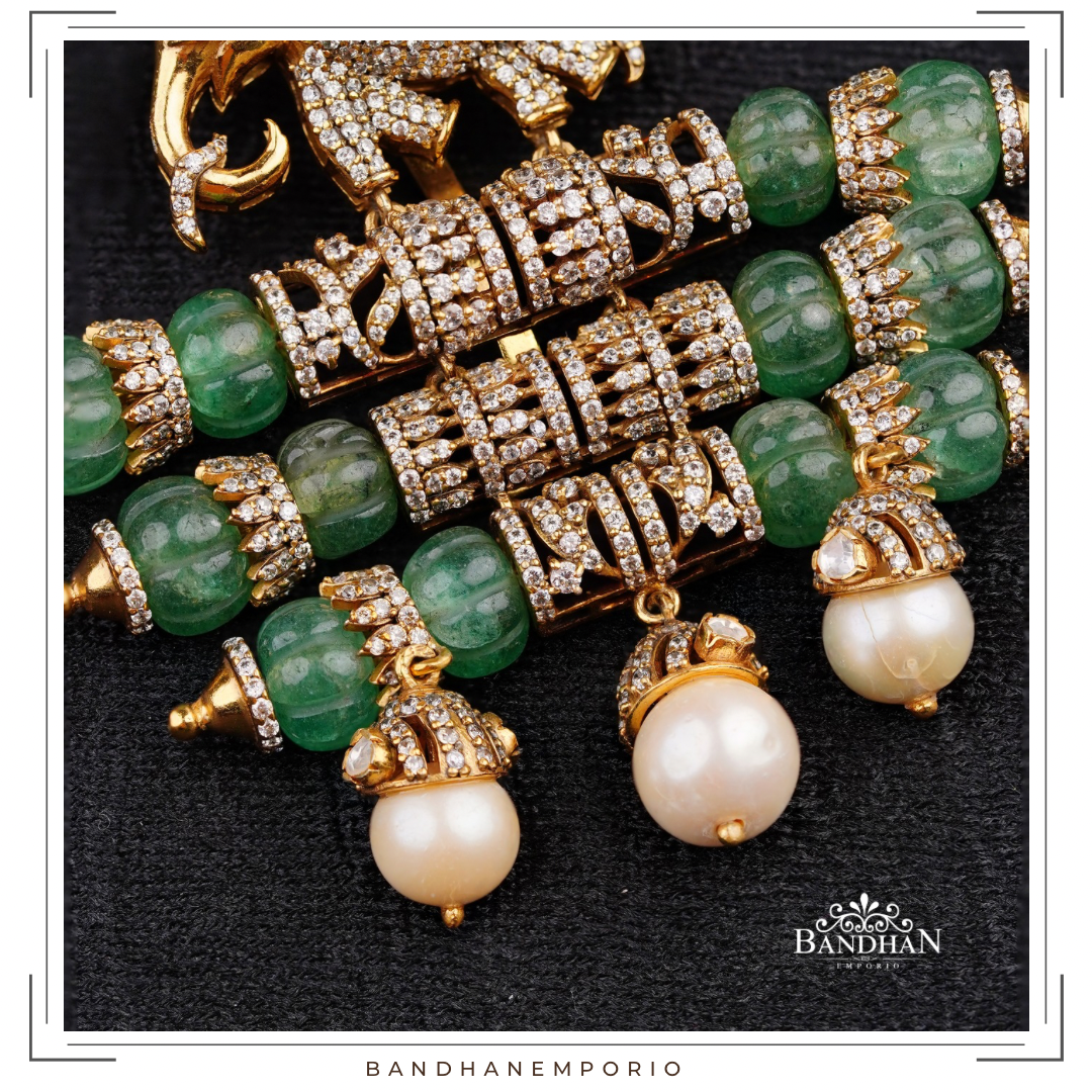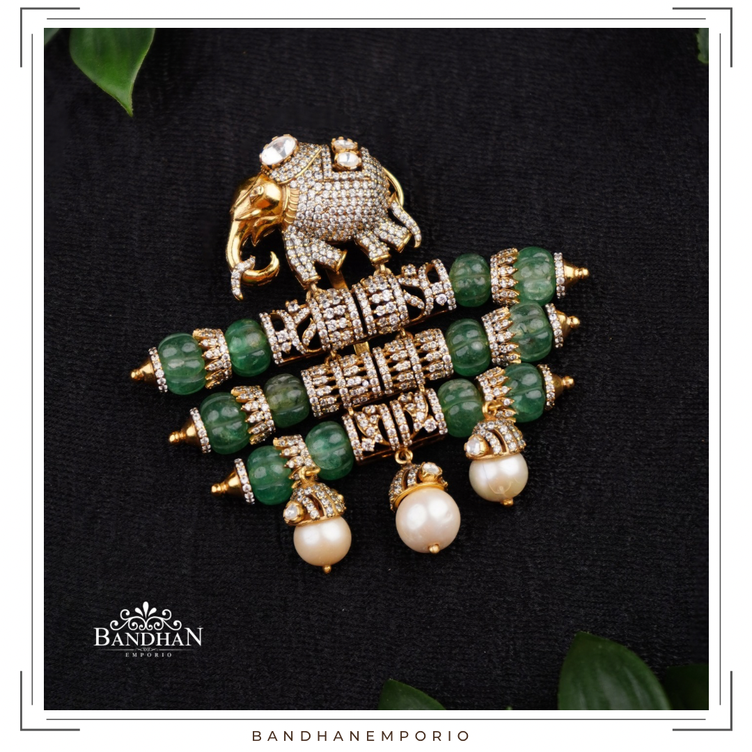 Handcrafted, 92.5 Silver Hallmarked, Detachable pendant with 24ct gold plating, studded with premium cubic zircons, precious carved emeralds, lab grown Polki and precious fresh water pearls. Pendant is detachable with s hook behind. Can be paired with Hasli or any beads chain.