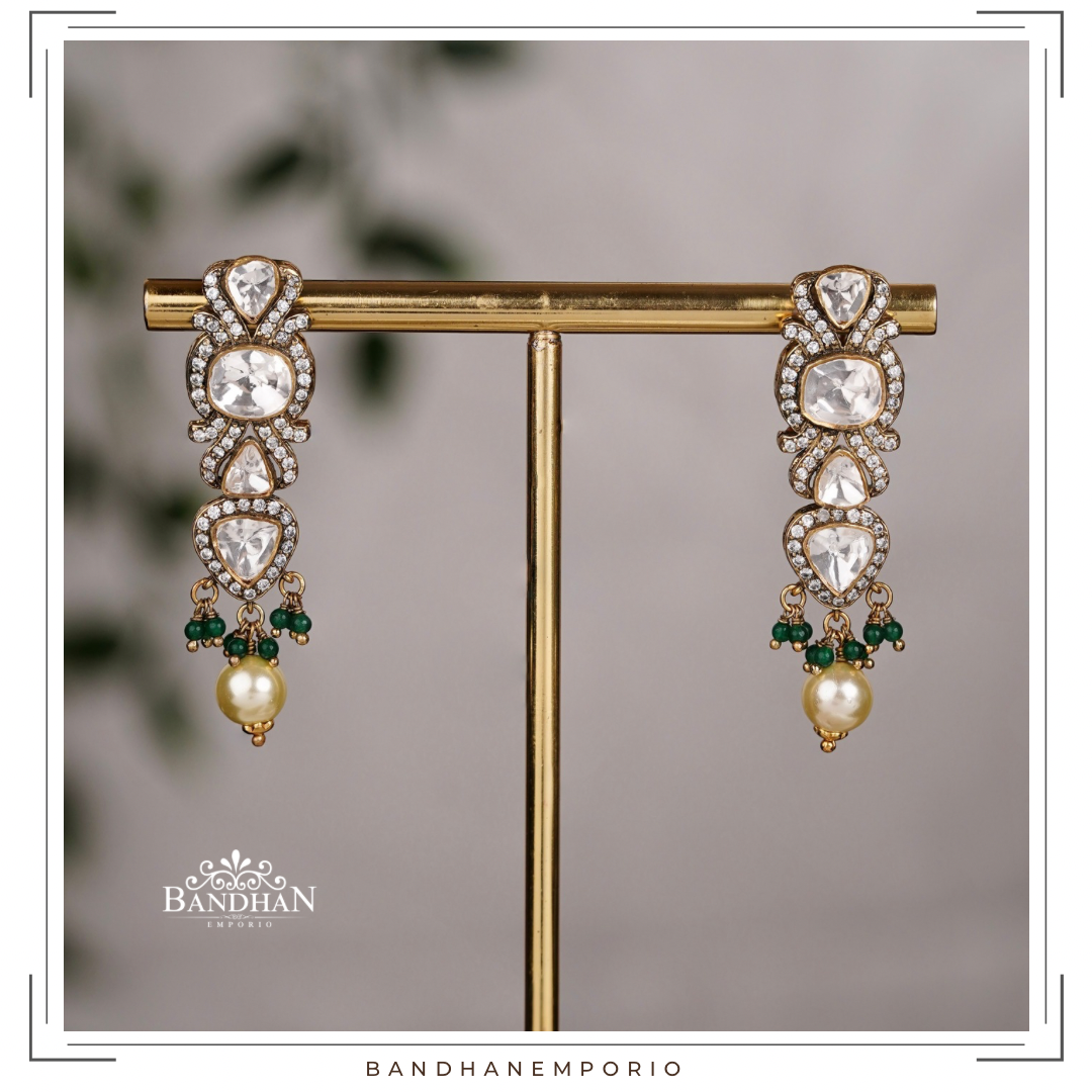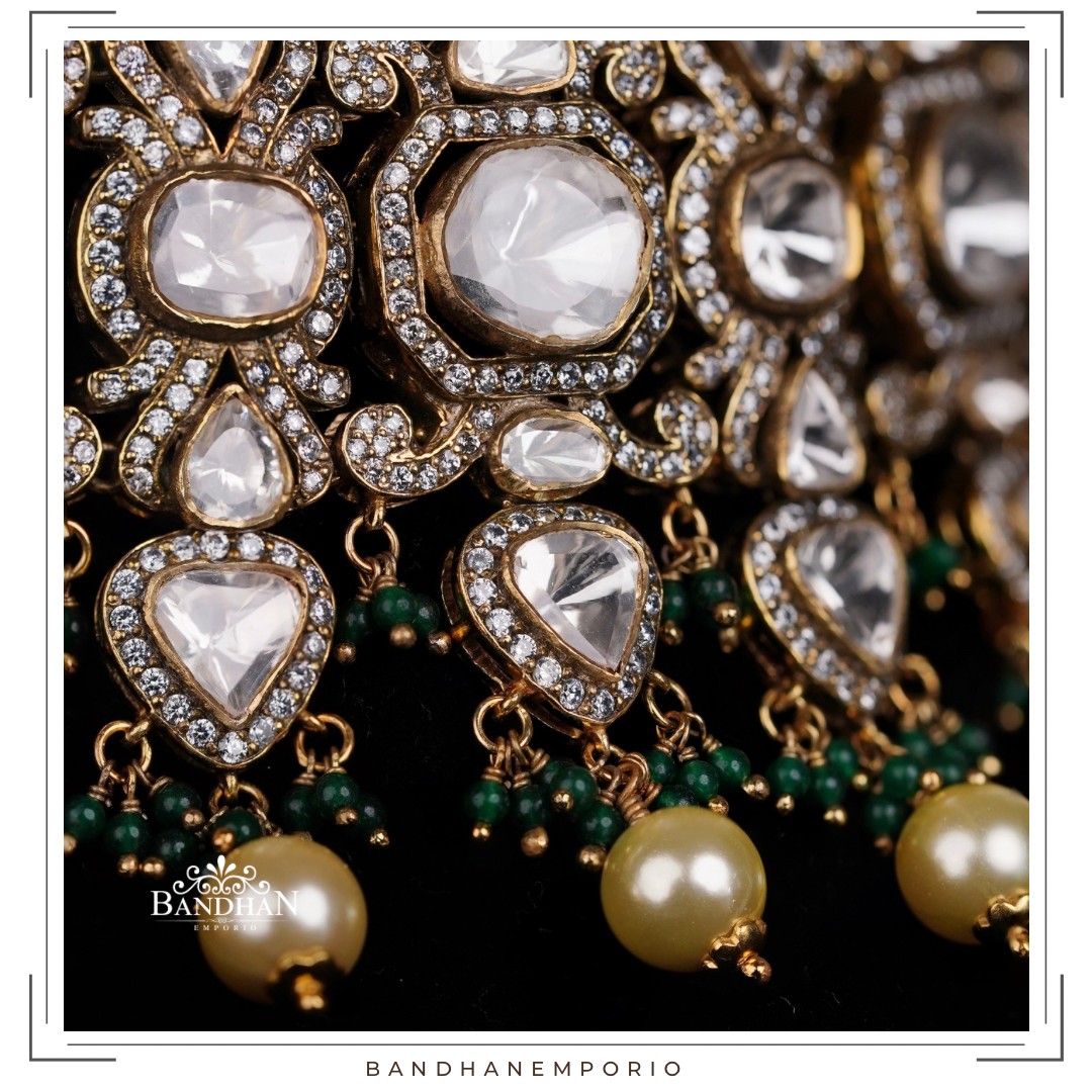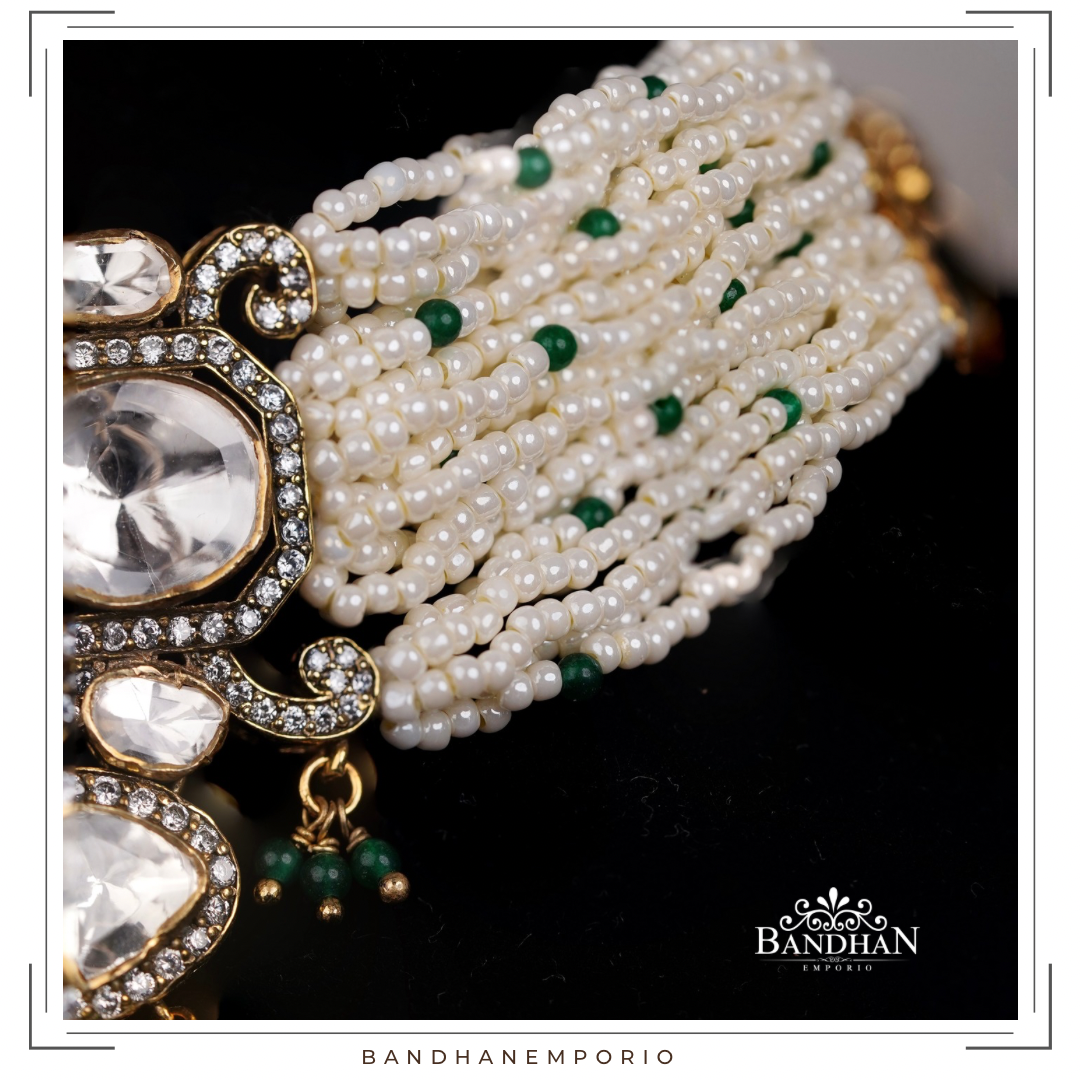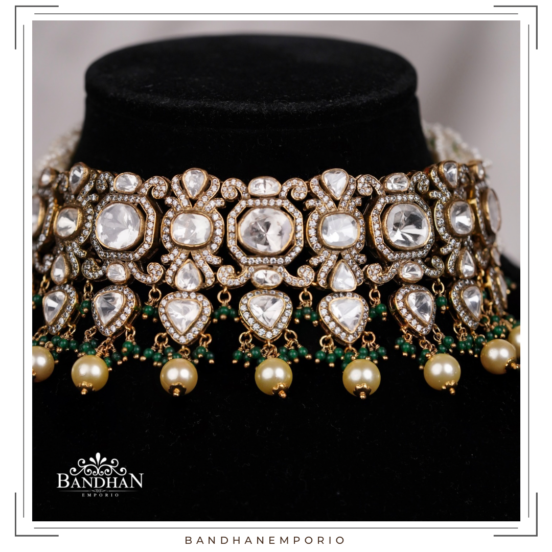 Handcrafted Polki choker Set, 92.5 Silver hallmarked, with 24ct gold plating, Victorian light antique finish, studded with premium quality simulated polki stones, premium cubic zirconia stones and Swarovski pearls. Comes with a pair of matching earrings, with supporting clip and screwback.