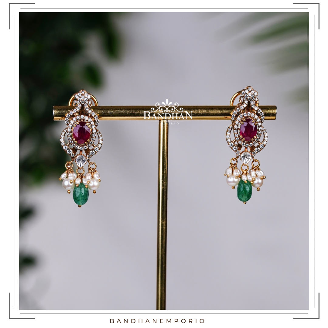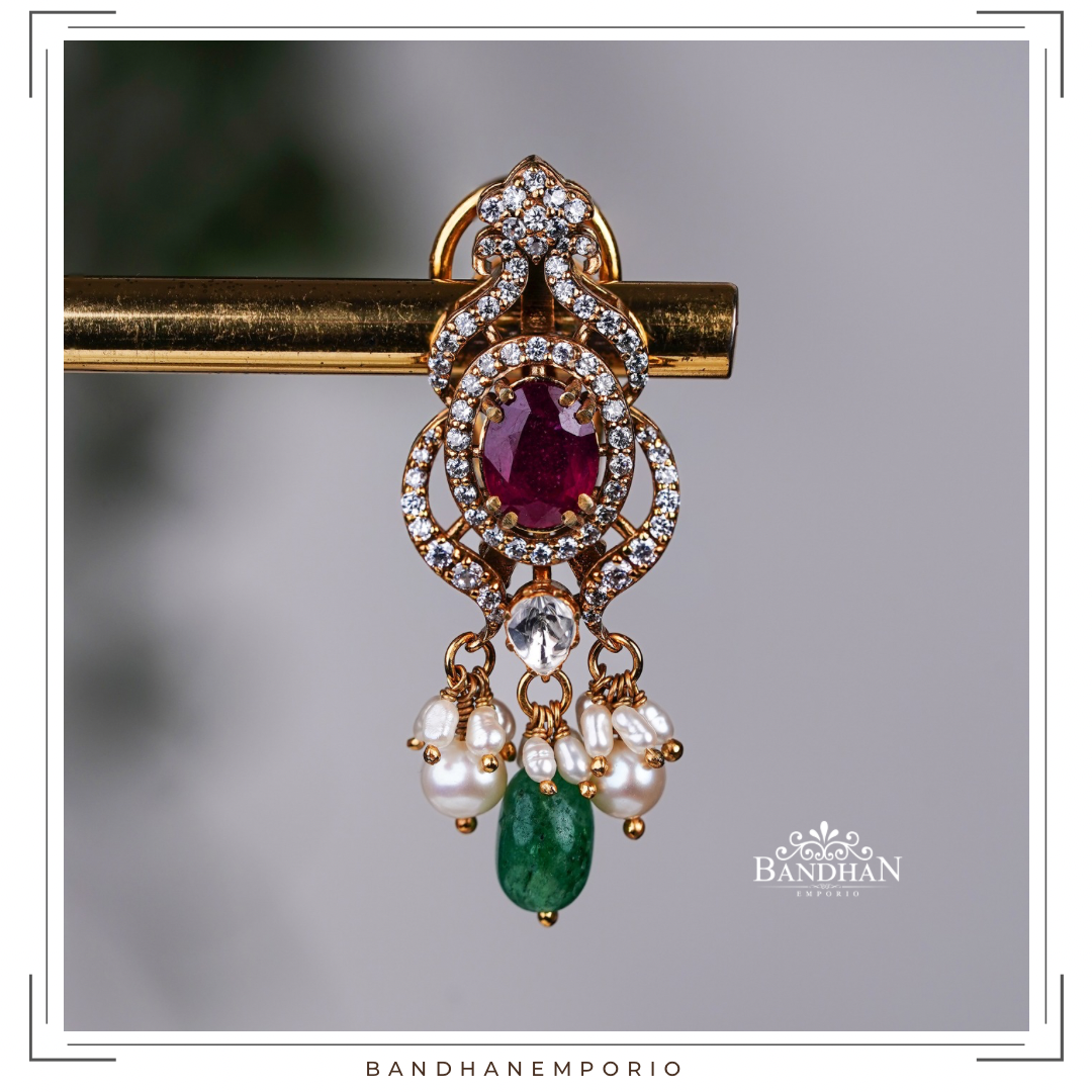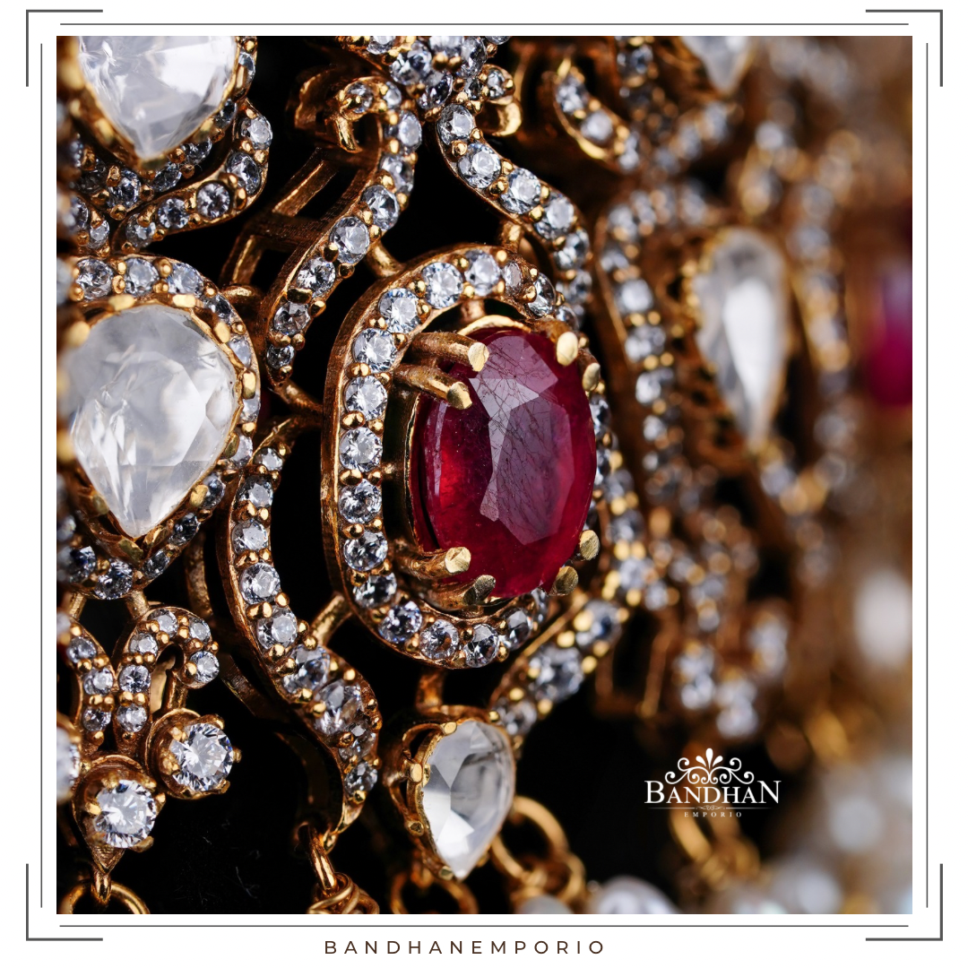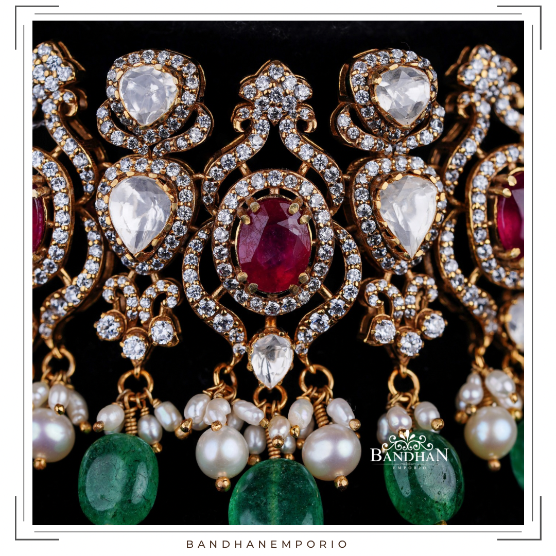 Handcrafted Polki choker Set, 92.5 Silver hallmarked, with 24ct gold plating, Victorian light antique finish, studded with premium quality simulated polki stones, premium cubic zirconia stones, premium certified precious natural rubies and certified precious emeralds, embellished with premium certified natural fresh water pearls. Comes with a pair of matching earrings, with supporting clip and screwback.