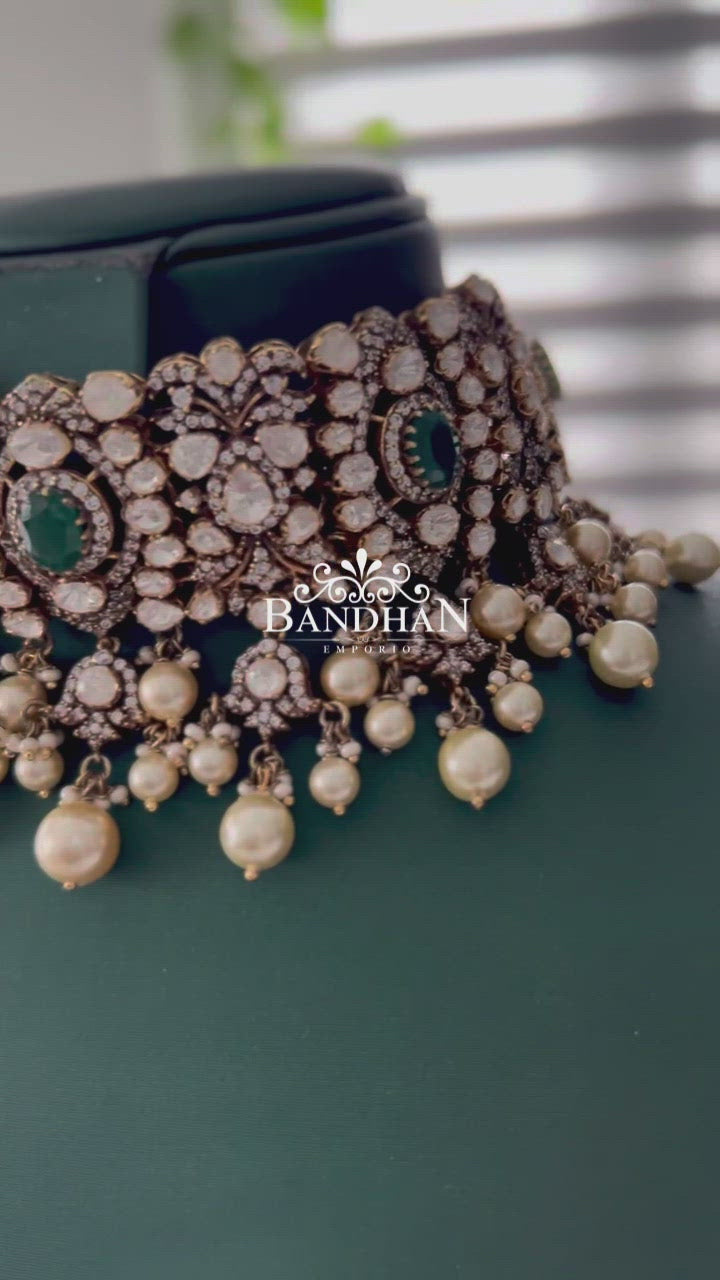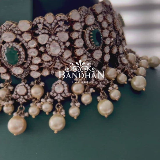 Handcrafted Polki Victorian choker Set, 92.5 Silver hallmarked, with 24ct gold plating, studded with premium quality polki stones, Swarovski stones and emerald beads, comes with a pair of matching earrings.